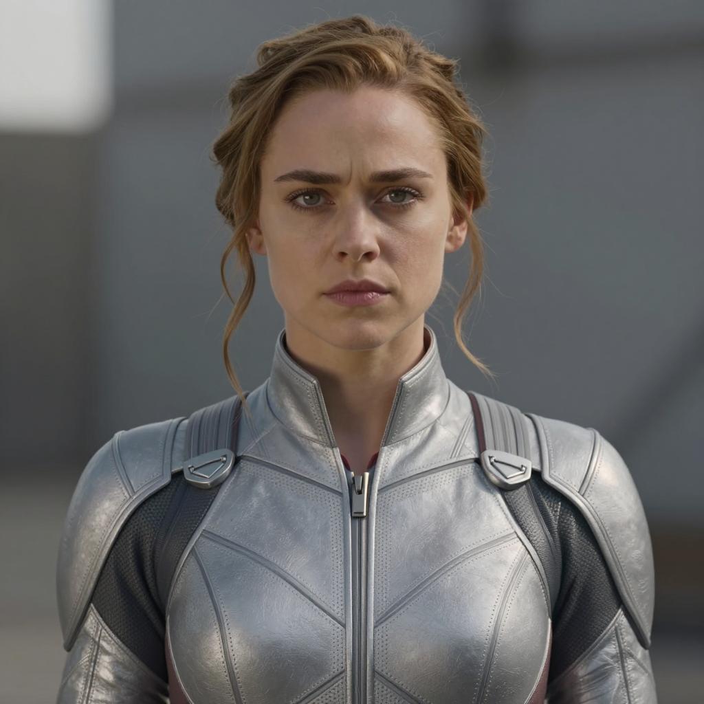 Deanna troi costume, photo of a woman, starfleet uniform, yellow and black, short brown hair, serious expression, blue eyes, earrings, modern sci-fi, indoors, realistic style, slightly soft lighting, portrait, standing, centered, plain background, upper body focus, detailed ures, professional look