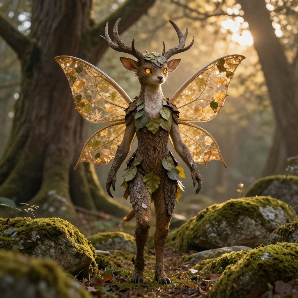 Photograph of a mystical deer fairy with glowing yellow eyes, antlers, leafy body, and translucent, golden-tinged wings in a sun