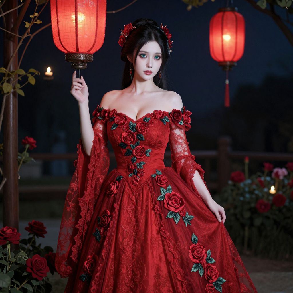 Photograph of a fair-skinned woman with dark hair styled in an updo, adorned with red roses. She wears an off-shoulder, lace red dress decorated with intricate floral embroidery and green leaves. She holds a lit red lantern in her right hand, with another lantern in the background. The scene is set at night, with a dark blue sky, and is surrounded by red roses and green leaves. Her expression is calm, and the overall mood is romantic and elegant. The image is rich in color, with a focus on red and green.