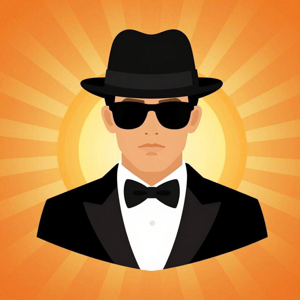 Mafia-themed icon featuring a man in a black fedora, sunglasses, and a tuxedo with a bow tie, set against a radiant orange sunburst background, representing the \"Gangstar Vegas - mafia game APK Cracked Download.\