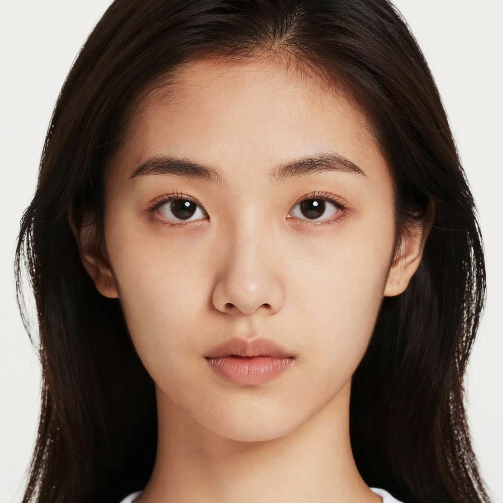 Close-up professional headshot of an Asian woman with natural makeup and long black hair. The image features detailed facial features, realistic skin texture, and soft natural lighting on a plain white background. The woman has a neutral expression with closed mouth, suitable for a passport or CV photo. High resolution and sharp focus with studio lighting.