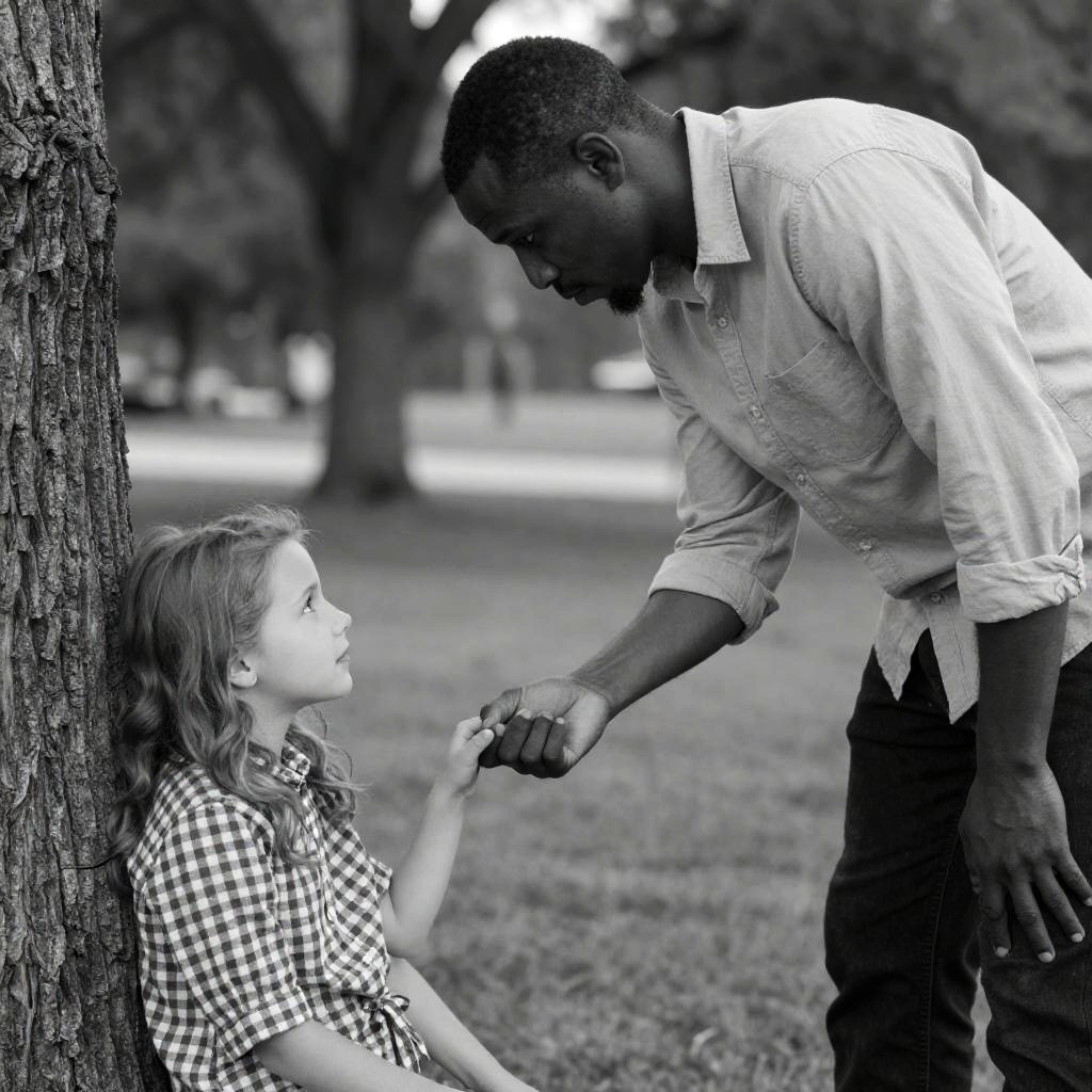 Black and white photograph of an older bearded man with a mustache and a young boy with an afro. The man wears a dark coat and a large pendant necklace, looking down at the boy who wears a turtleneck sweater. The boy looks up at the man with a slight smile. They are outdoors with a blurred background. The man's expression is gentle, and the boy's expression is curious.