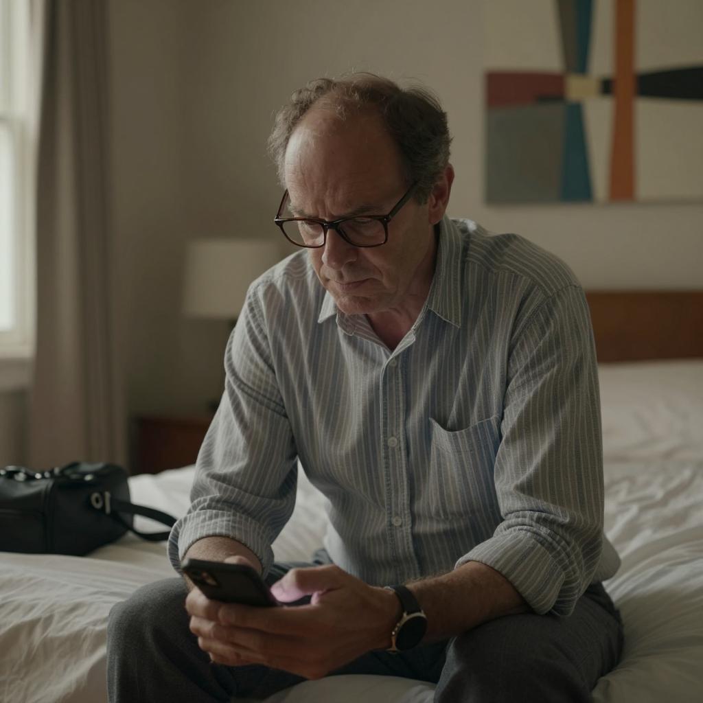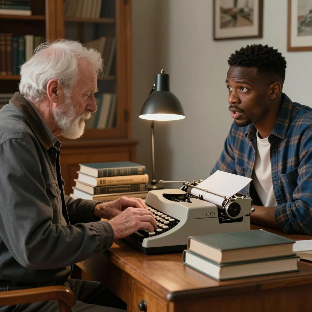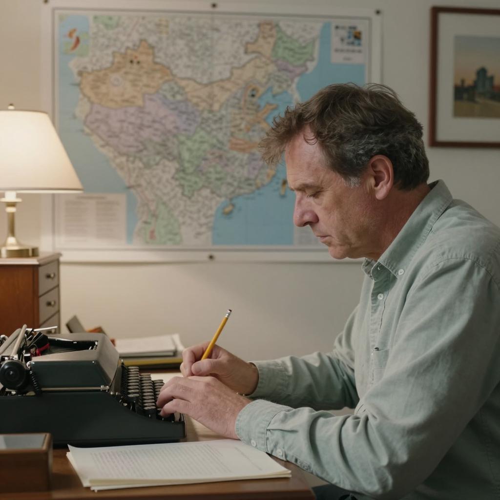 Middle-aged man with short brown hair, light green shirt, sitting at desk, writing with pencil. Map on wall behind him. Old typewriter with coiled cord on left. Wooden box with drawers on left side. Lamp with white shade on left. Wall with framed pictures on right. Intense facial expression. Realistic photograph.