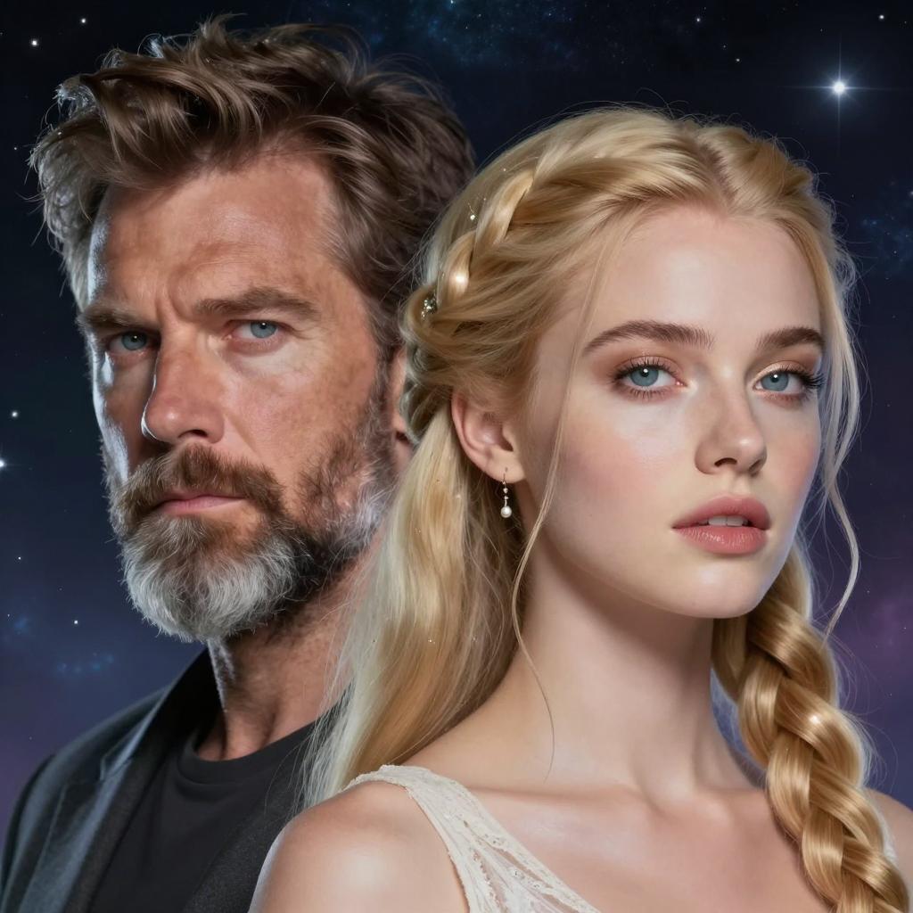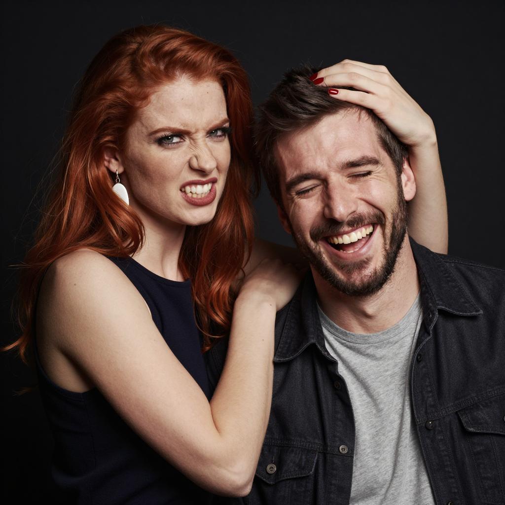 Close-up photograph of a bearded man with dark hair and a concerned expression, and a woman with red hair and hoop earrings, leaning her head against his. She has closed eyes and a slight smile. Dark background. Both wear brown jackets. Her arm is around his neck.
