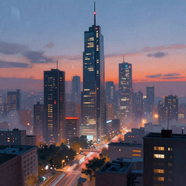 Cyberpunk Subculture sunset, the center of a Japanese city, buildings, up-looking view, misterious feeling, anime bg, matte painting, style of shinkai makoto.,