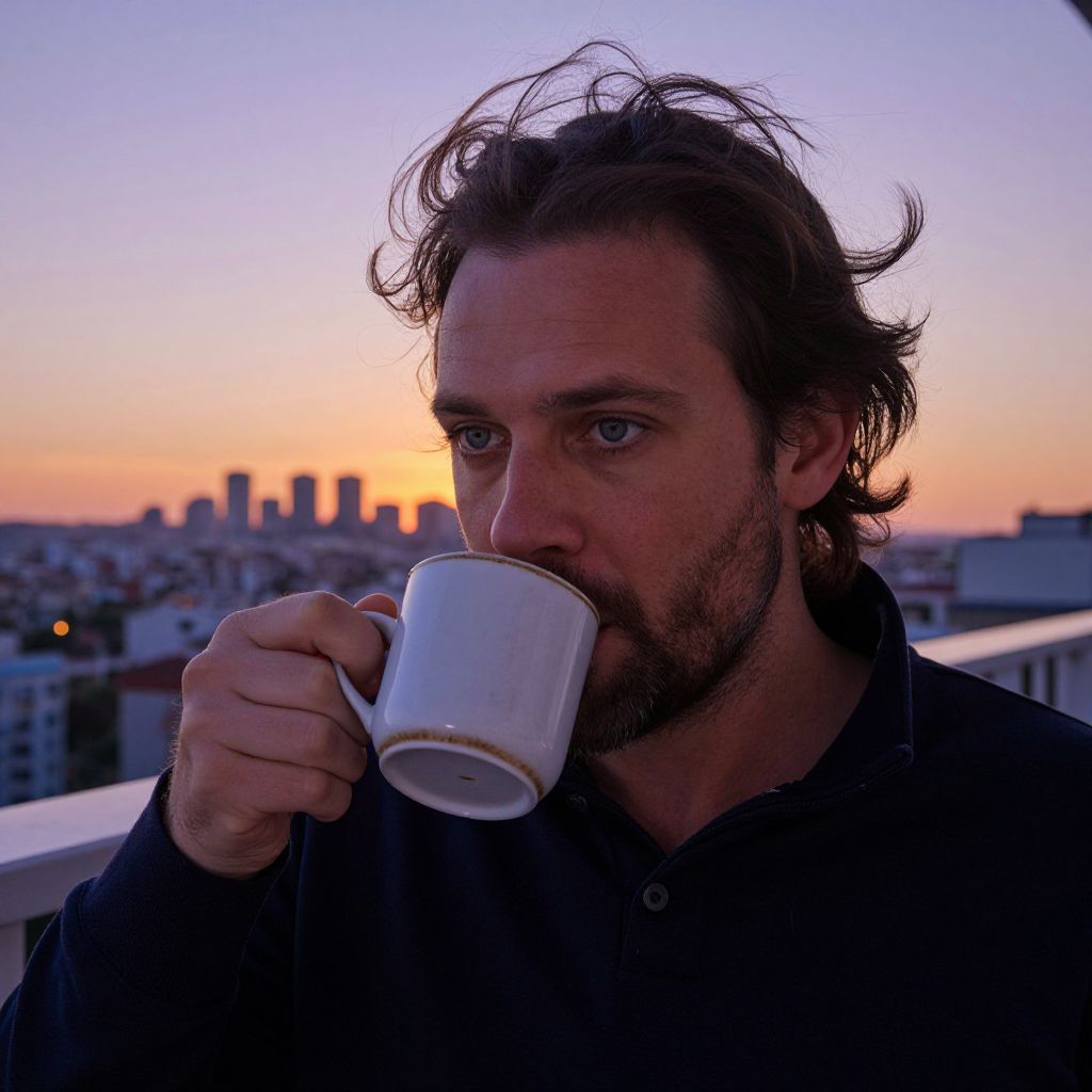 A relaxed man with kind, tired-looking gray eyes and a beard sips black tea from a chipped ceramic mug on a balcony at sunset, the city skyline glowing in the distance with soft purple and orange hues, wind gently stirring his hair