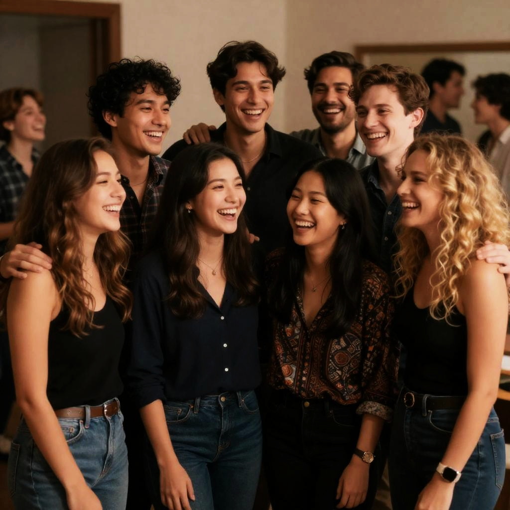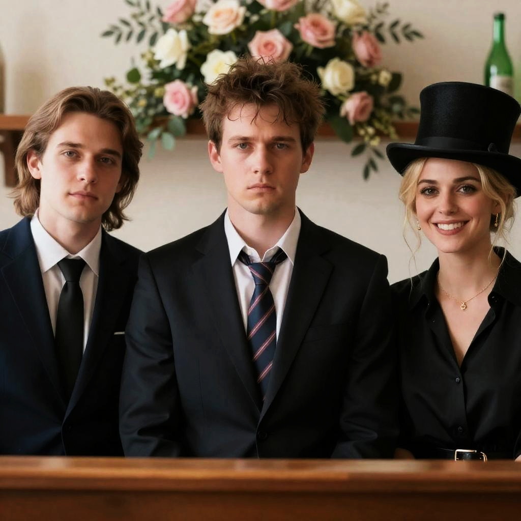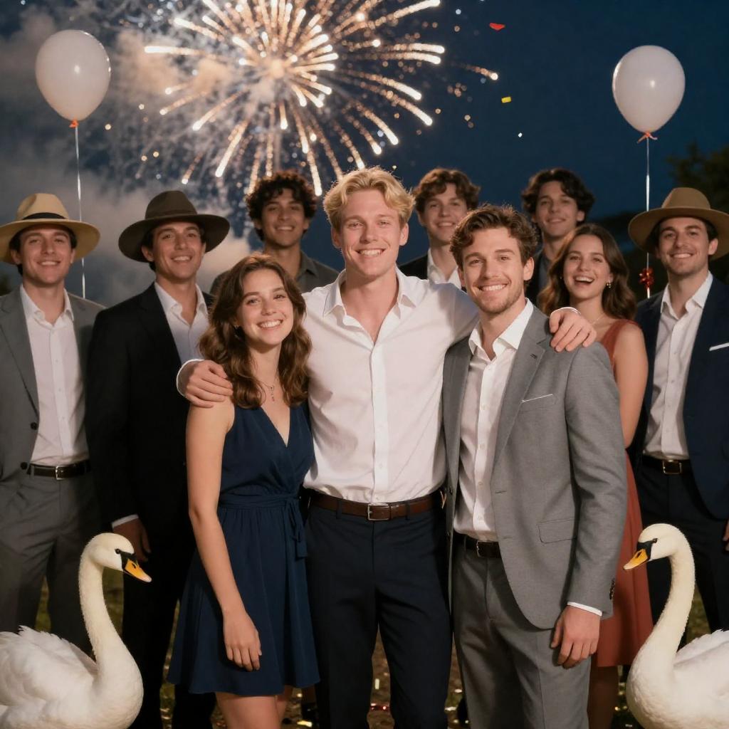 Photograph of a celebratory scene with ten people. Central male with blond hair and white shirt smiles, arms around brunette and brown-haired man in gray suit. Background includes fireworks, balloons, and confetti. People wear formal and casual clothes, some with hats. Two swans on ground. Intense and joyful expressions.