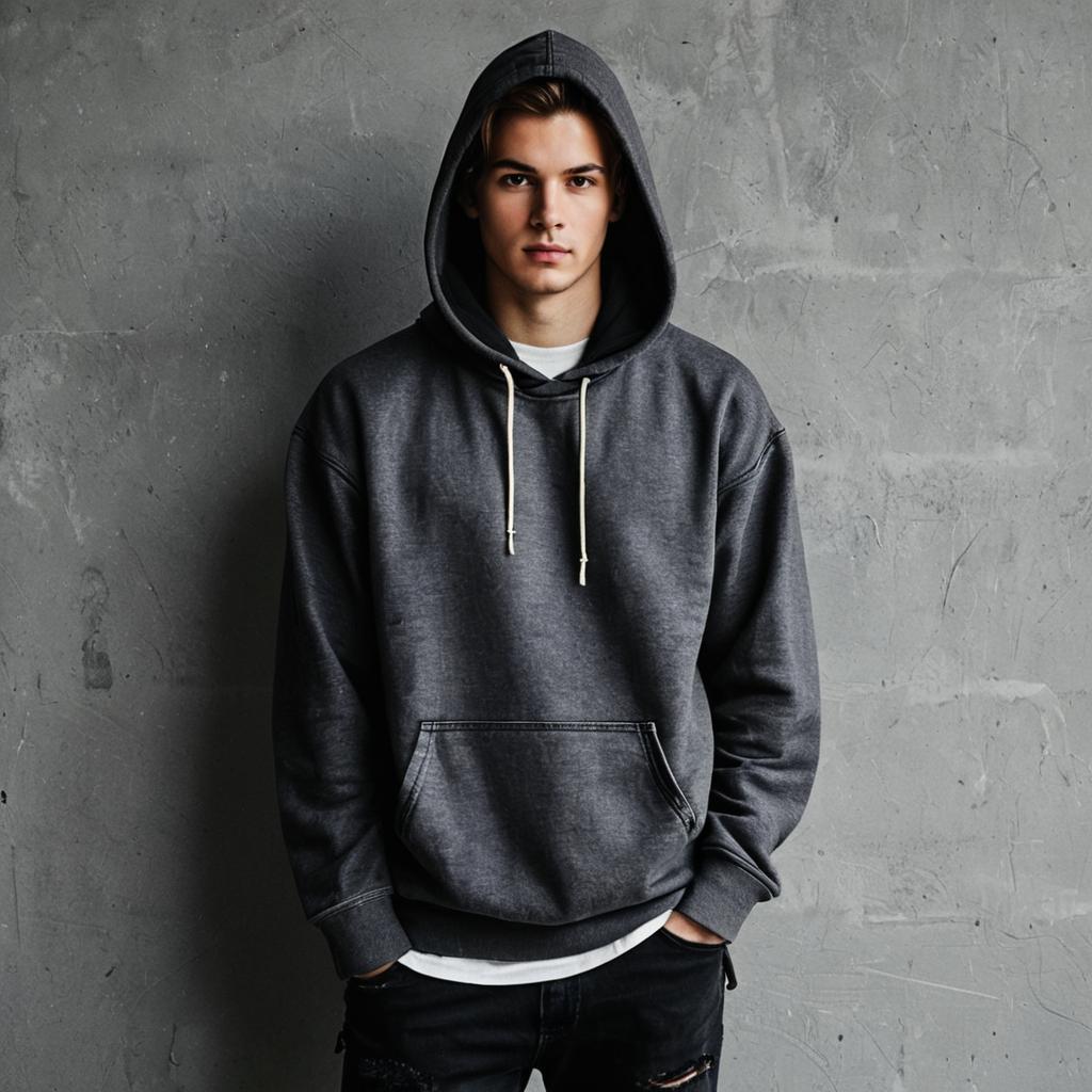 Photorealistic portrait of a young attractive man with short brown tousled hair and light skin. He has a serious expression and is wearing a gray crew neck t-shirt. The subject stands casually against a beige wall with visible cracks, captured in soft natural lighting and medium close-up angle.