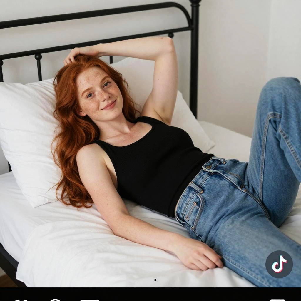 Photograph of a pale-skinned woman with long, red hair lying on a bed with white sheets and a black metal headboard. She's wearing a black sleeveless top and blue jeans, smiling at the camera with one arm behind her head. The room is well-lit with natural light. A white pillow is visible behind her. A TikTok watermark is in the bottom right corner. Social media interface elements are at the bottom.