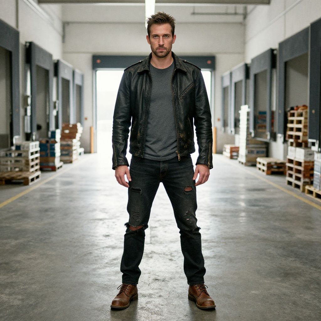 Photograph of a muscular, Caucasian man with short, spiked brown hair and a trimmed beard, standing in an industrial warehouse. He wears a black leather jacket over a gray t-shirt, black jeans with decorative stitching, and brown boots. The warehouse has a bright, white-lit background, with rows of stacked pallets on both sides and a concrete floor. The man stands confidently in the center, looking directly at the camera with a serious expression. The lighting creates a strong contrast, highlighting his figure against the dimly lit warehouse.