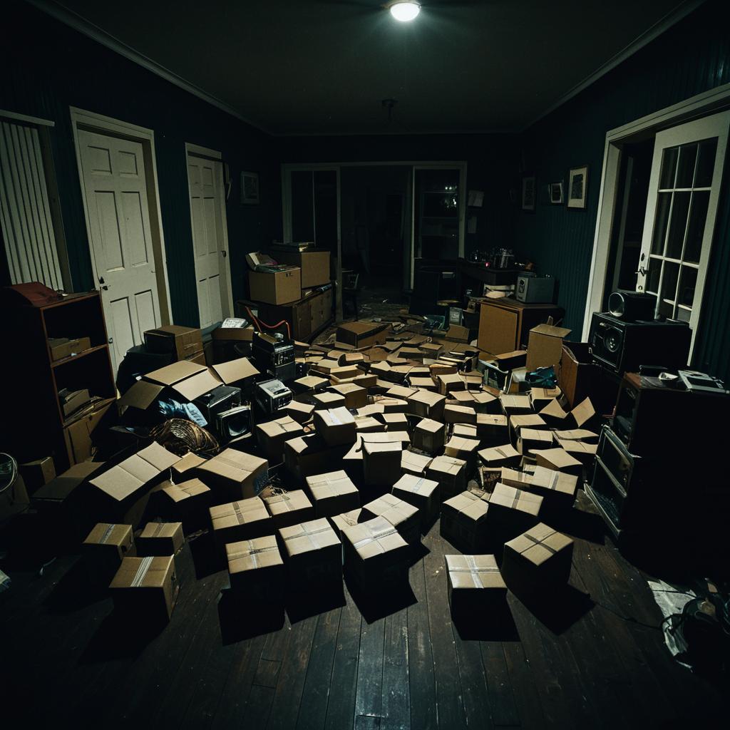 Gustave Doré lots of packing boxes spread out on floor, in small dark moody empty room of mid-century australian discheveled suburban home, moody, no lights, night time, very dark, camera angle at floor level, atmospheric, dim, anamorphic,