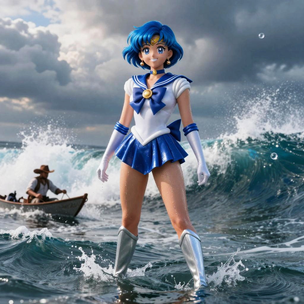 Digital artwork of Sailor Moon with blue hair, white and blue sailor uniform, standing in ocean waves, with a small boat and person in the background under