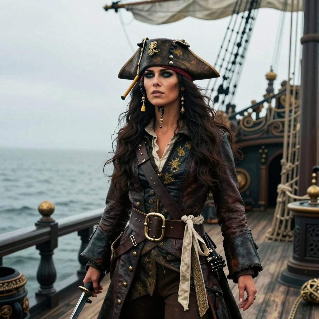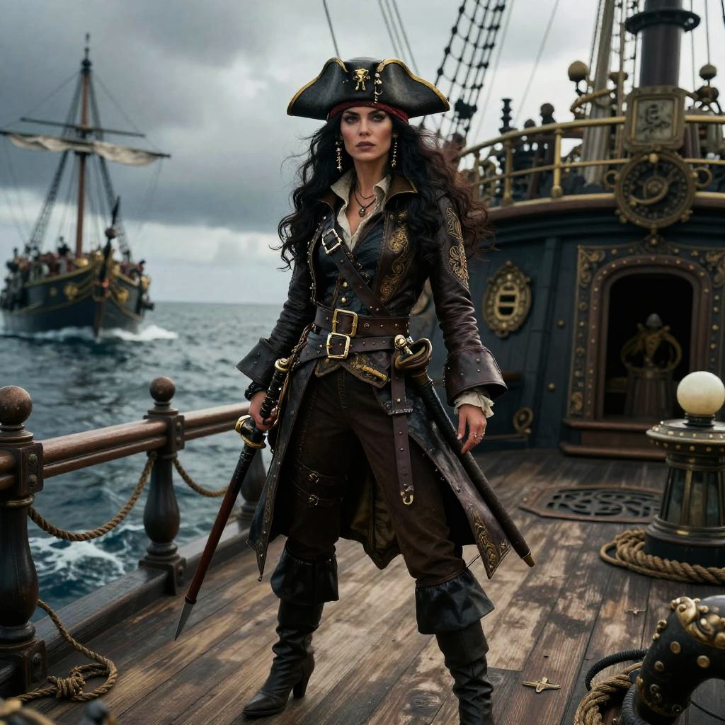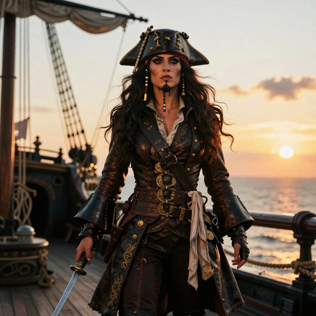 Valiant seafarer, pirate queen with long flowing dark hair, dressed in a detailed leather pirate coat with gold embroidery, standing on the deck of her ship at Crimson Atoll, bathed in sunset hues