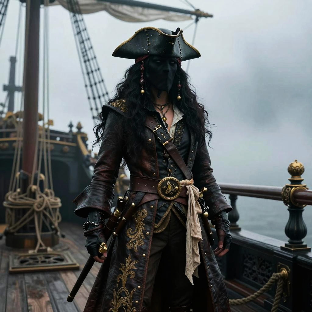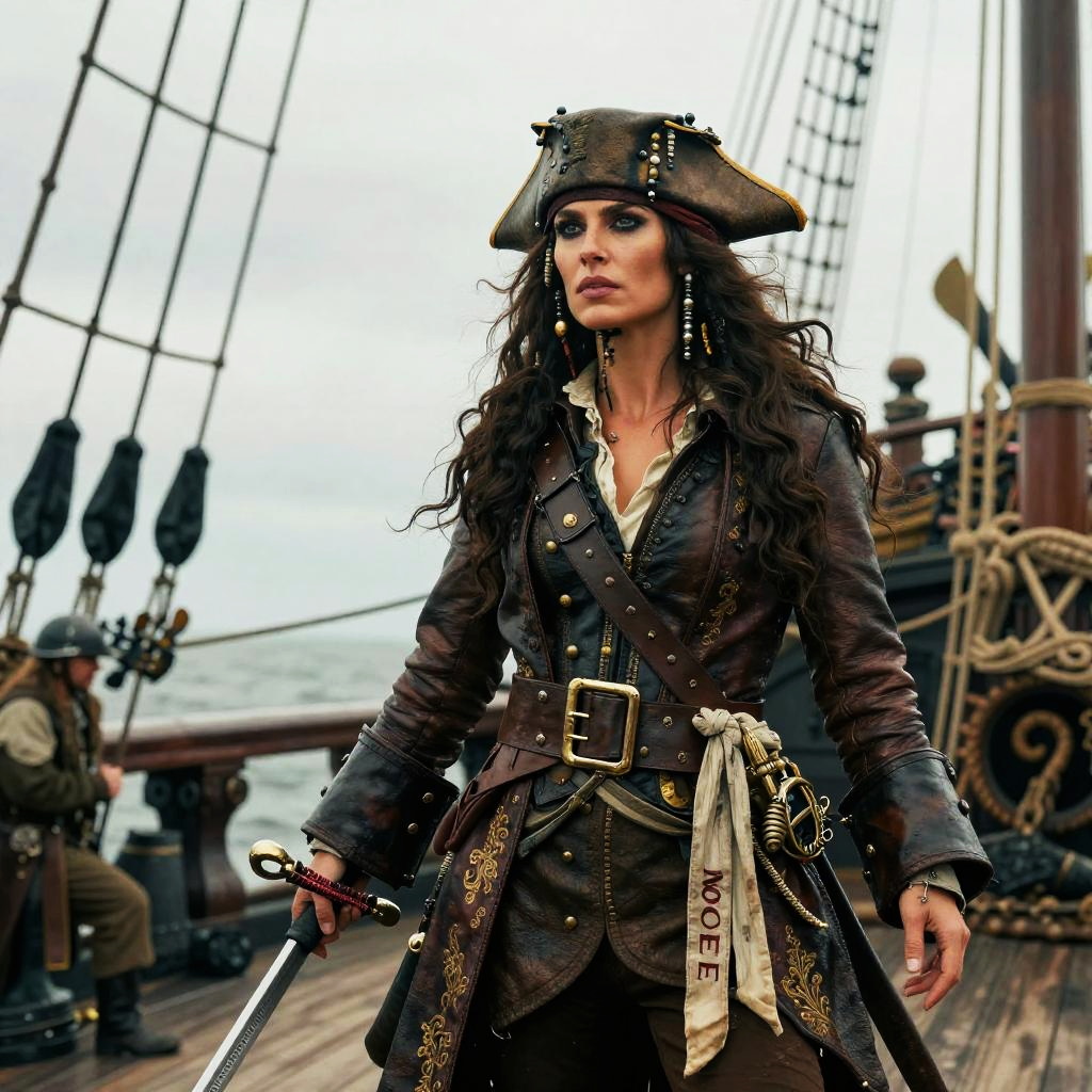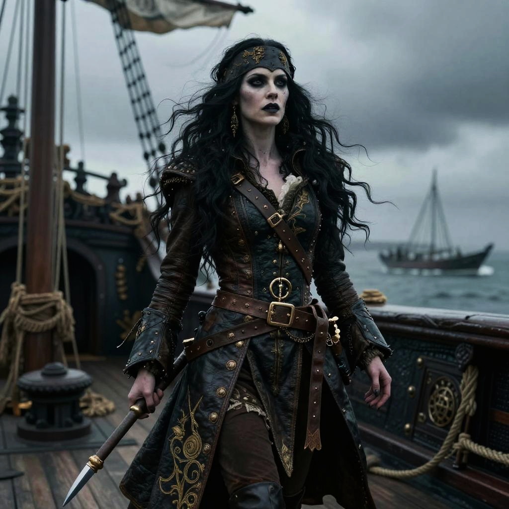 Valiant seafarer, pirate queen with long flowing dark hair, dressed in a detailed leather pirate coat with gold embroidery, standing on the deck of her ship at Crimson Atoll, bathed in sunset hues