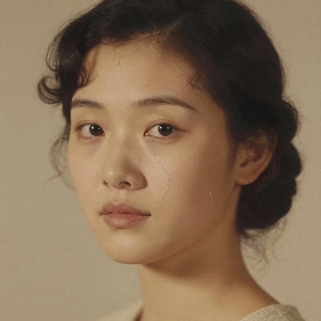 Dreambooth inpainting focused on a vintage portrait restoration, seamless blending of cracks and missing details with realistic skin texture and subtle color tones