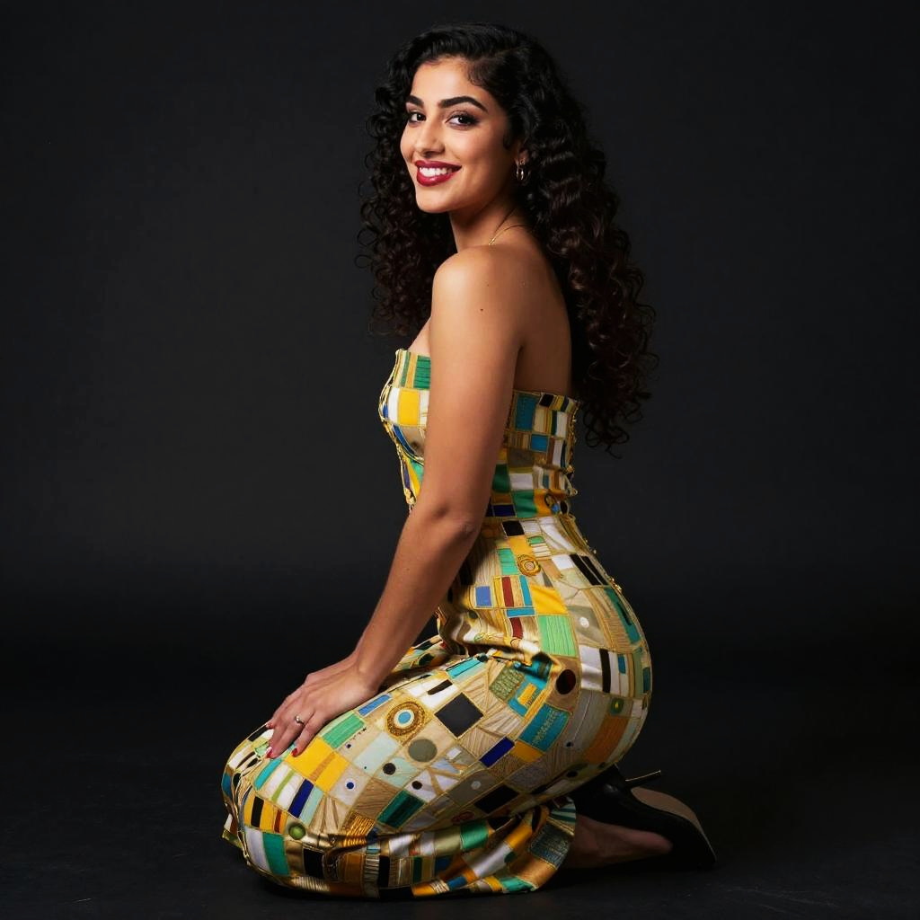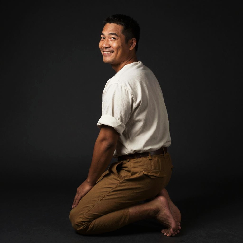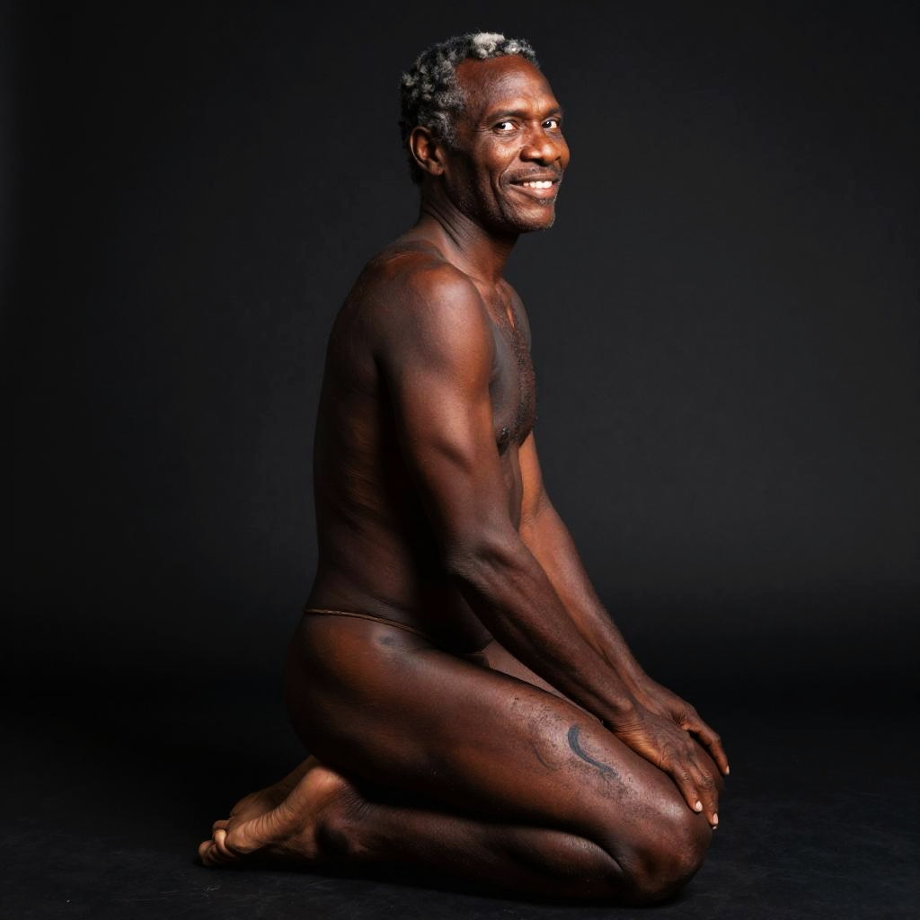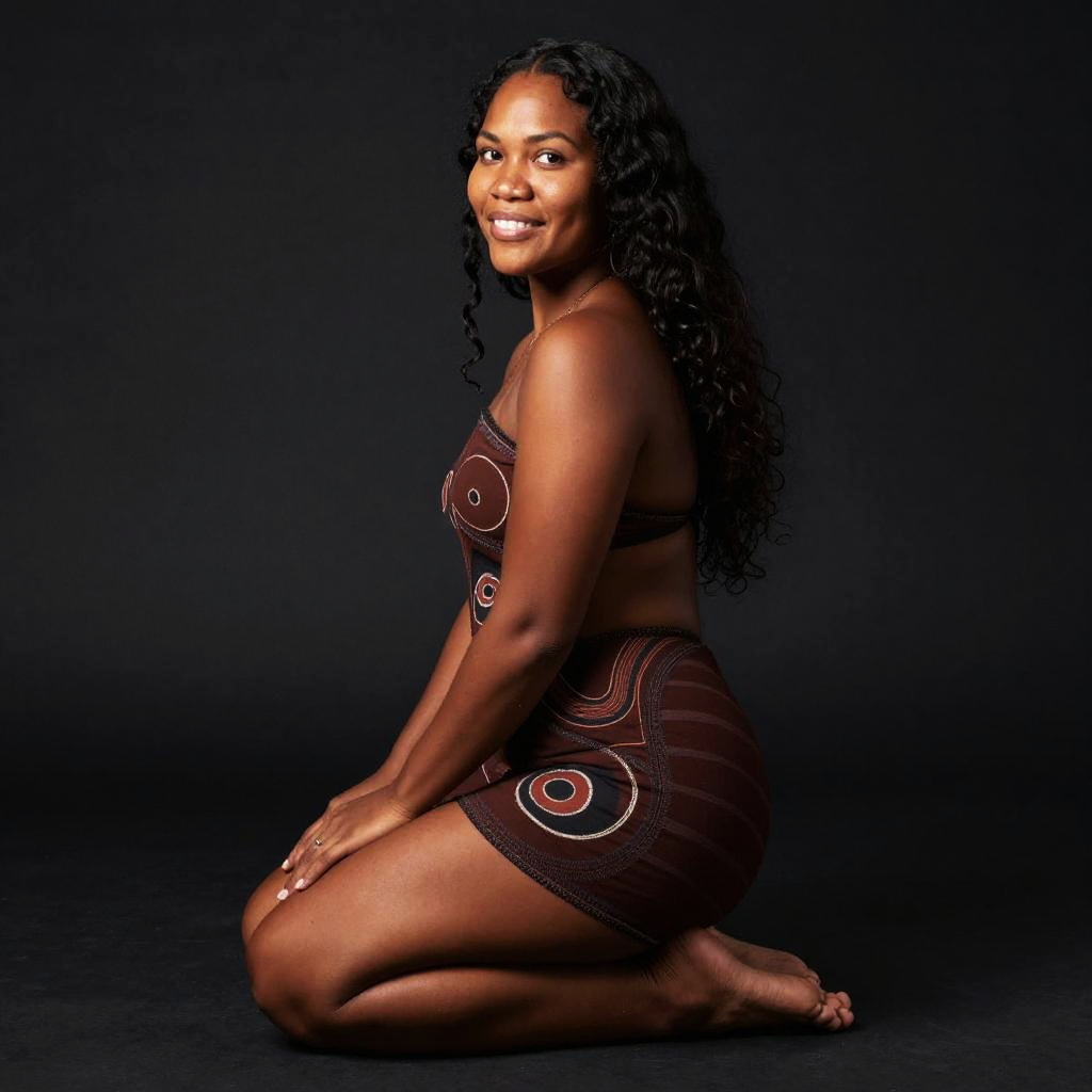 Portrait of a 25-year-old Pacific Islander woman, kneeling and looking back with a smile, in the style of Emily Kame Kngwarreye, Lisa Congdon, dark artistic strokes, pure black background, photorealistic studio lighting, high resolution