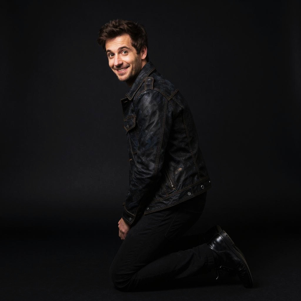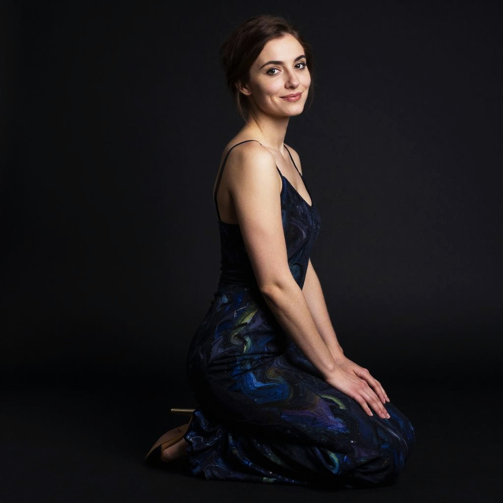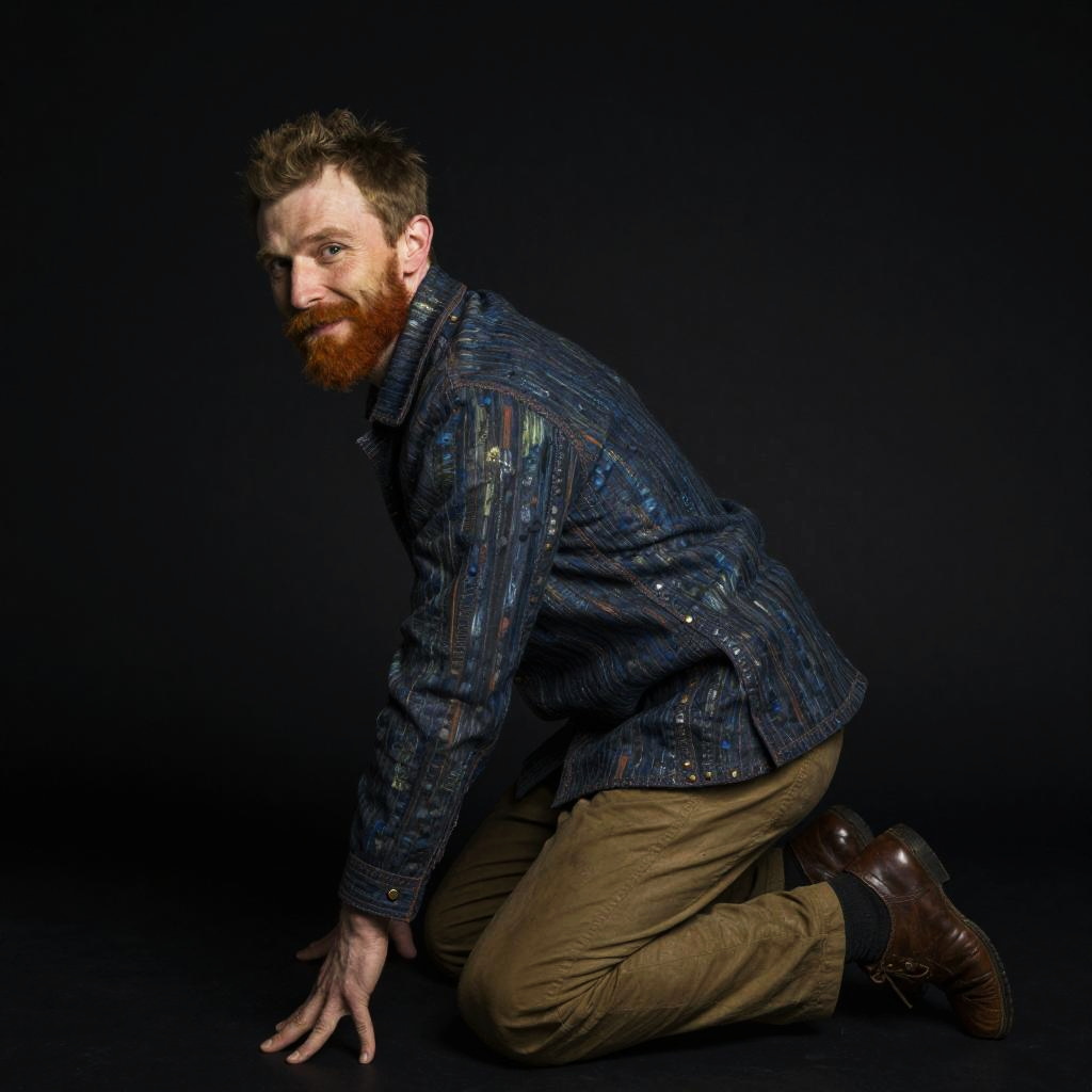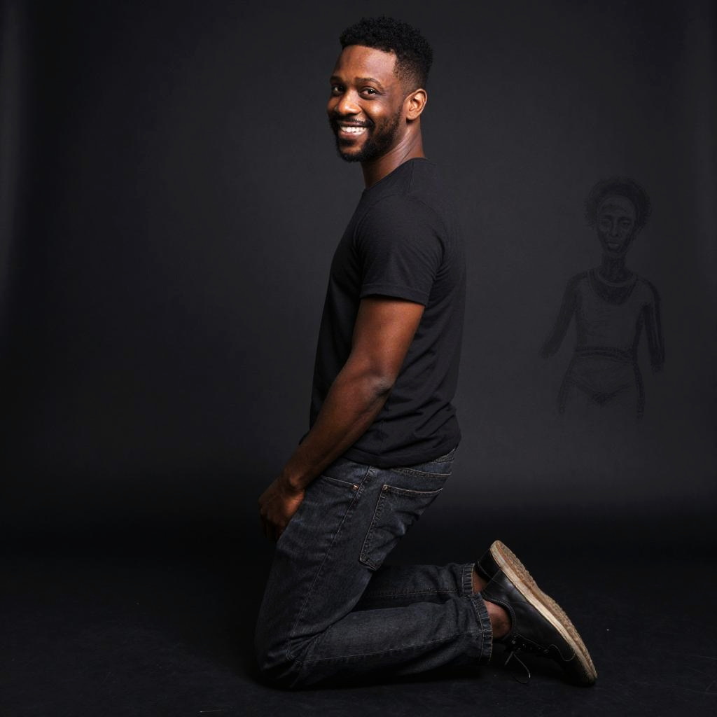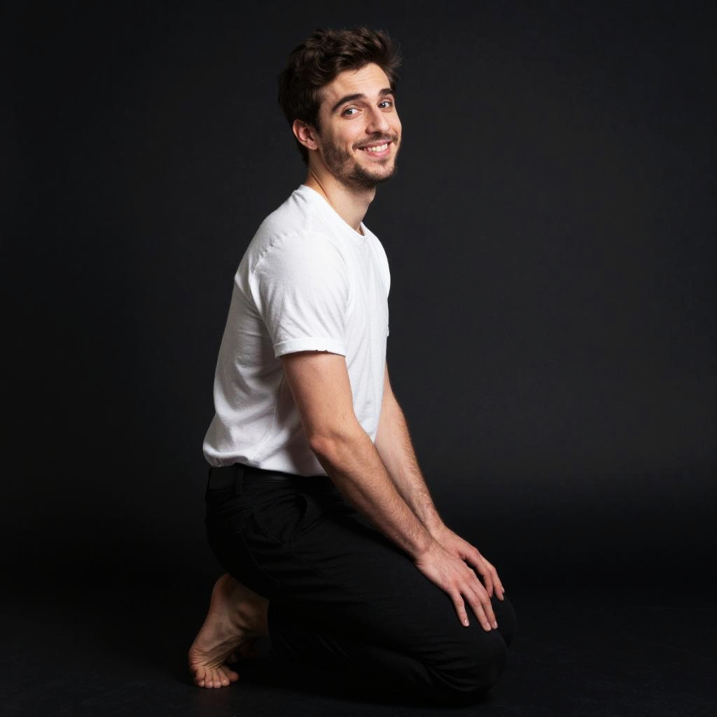 Portrait of a 25-year-old Pacific Islander woman, kneeling and looking back with a smile, in the style of Emily Kame Kngwarreye, Lisa Congdon, dark artistic strokes, pure black background, photorealistic studio lighting, high resolution