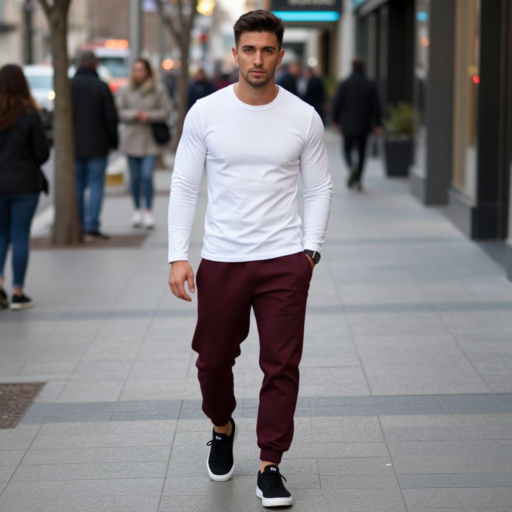 Photograph of a handsome, fit man with short dark hair, wearing a white long-sleeve shirt, maroon joggers, and black sneakers