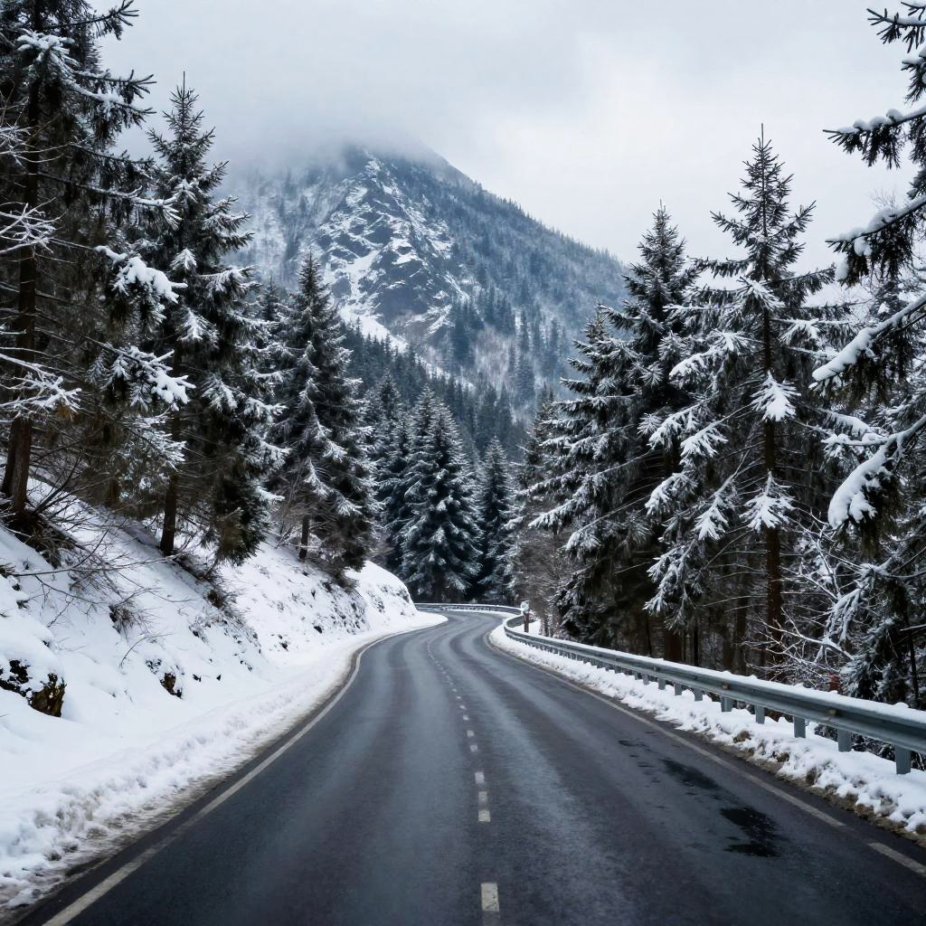 A winding mountain road flanked by dense pine trees covered in snow. The asphalt road appears wet and slick, curving gently to the right with metal guardrails on one side. Steep snow-covered mountains rise in the background, partially obscured by misty clouds. The scene features cool tones of blue and gray, capturing a serene winter landscape.
