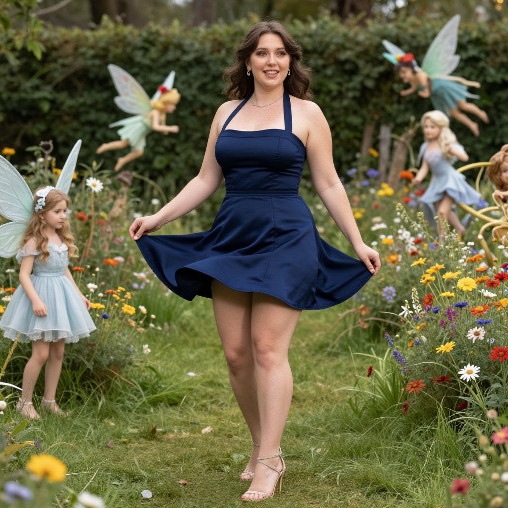 A Stocky woman in a fitted navy satin mini dress with a halter neckline and strappy high-heeled sandals, standing in a Wonderland meadow with playful sprites, joyfully twirling as she enjoys the whimsical surroundings. Visual style: Diego Fazio. Sexy. Pretty face and beаutiful eyes. Big breasts