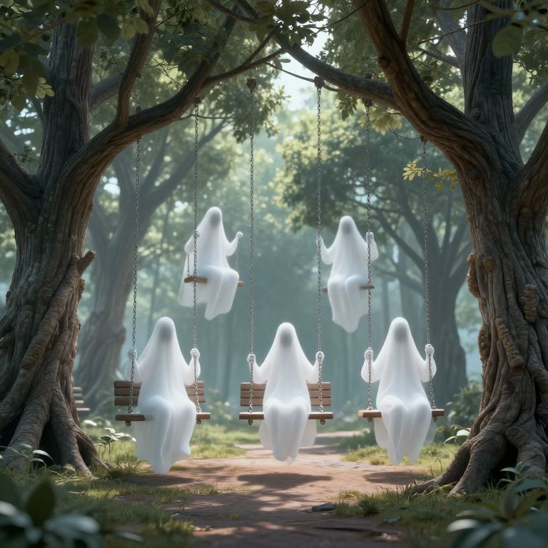 A surreal 3D-rendered park scene features ghostly white figures seated on benches and swings suspended mid-air, emerging from the gnarled trunks of towering trees, creating an ethereal and dreamlike atmosphere with soft, diffused lighting.