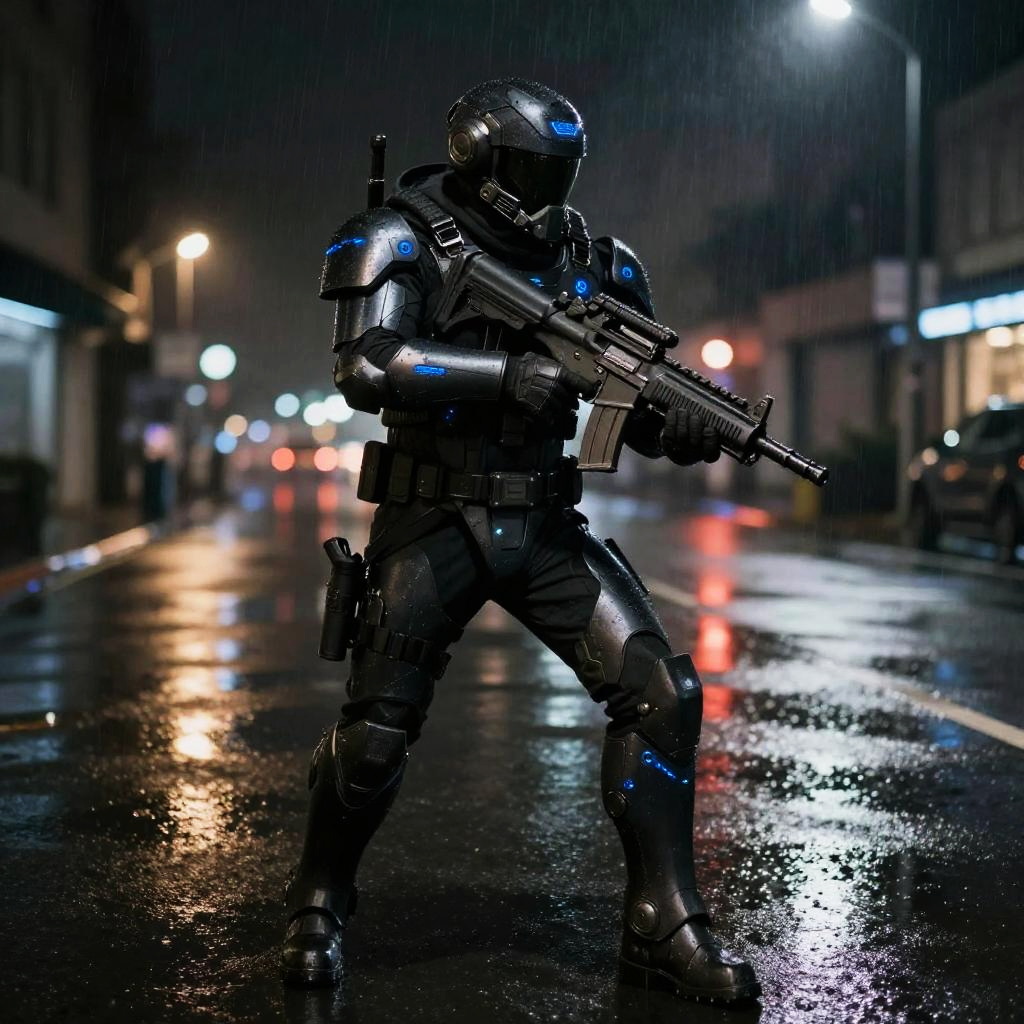 Shadbase soldier equipped with advanced weaponry, sleek dark armor with glowing blue accents, stealthy posture in urban nighttime setting, rain-soaked streets with reflective puddles, cinematic composition with depth.