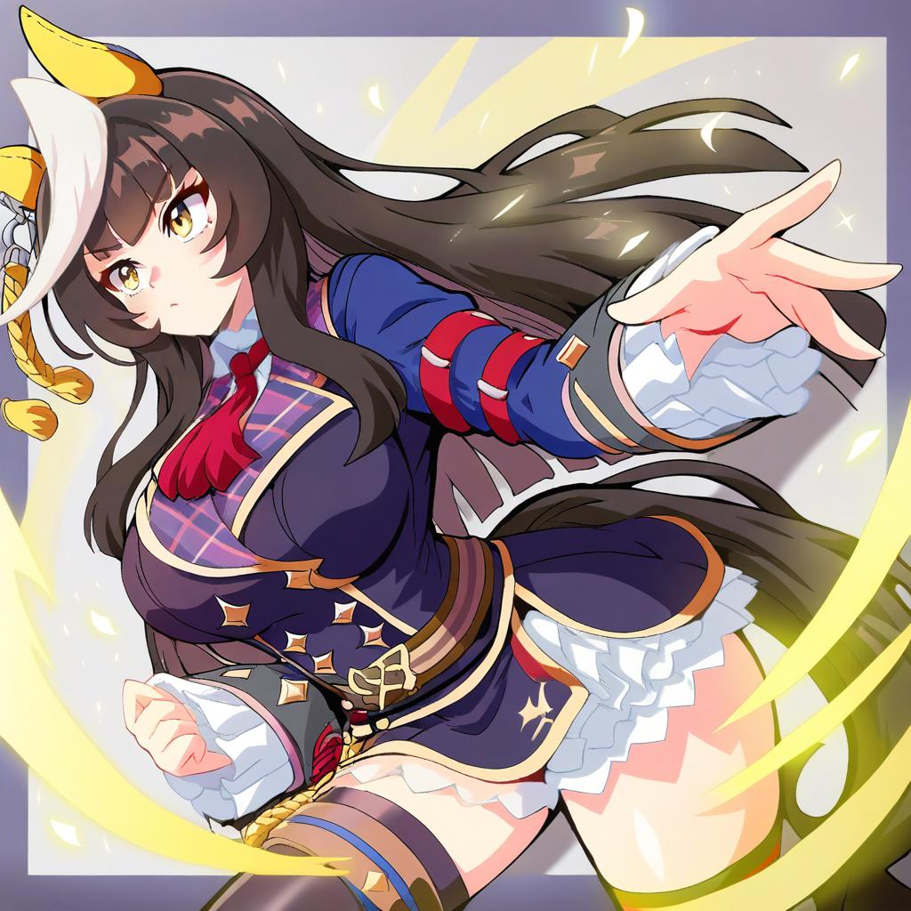Calstone light o (umamusume), umamusume, 1girl, horse girl, horse ears, horse tail, ear covers, yellow eyes, black hair, long hair, white hair, ahoge, blunt bangs, hime cut, by artist lewdamone, animagine