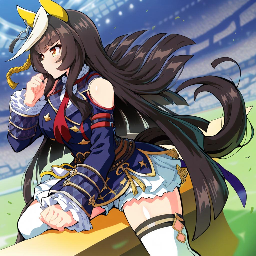 Digital anime-style illustration of a female horse girl character with long black hair, yellow eyes, and horse ears wearing a detailed blue and white outfit with red accents. The character has a white sailor-style hat with yellow ear covers and is posed thoughtfully in a stadium setting. The attire includes a blue jacket with gold trim, a red necktie, and thigh-high white stockings with black bands.