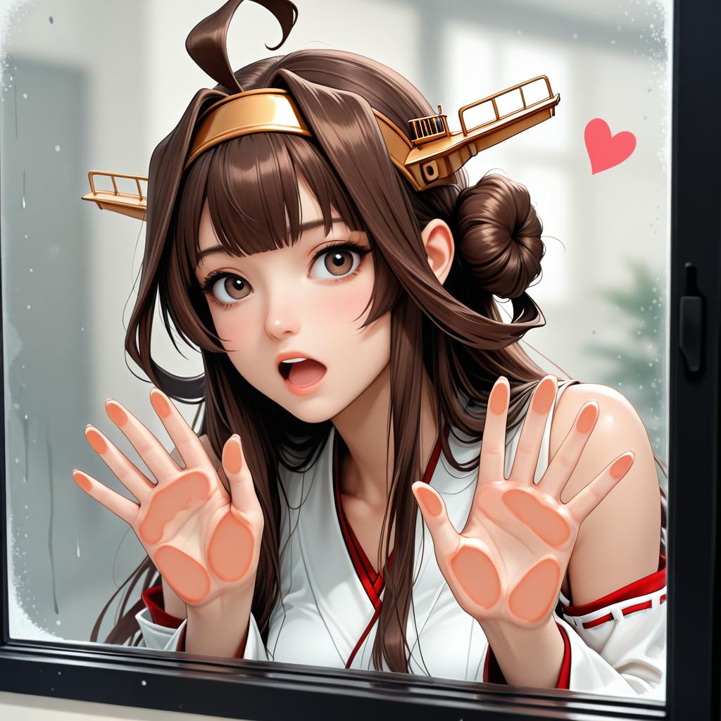 Swf, SFW, kongou_kancolle,1girl,brown hair,long hair,ahoge,solo,against glass,heart,double bun,hair bun,open mouth,headgear,looking at viewer