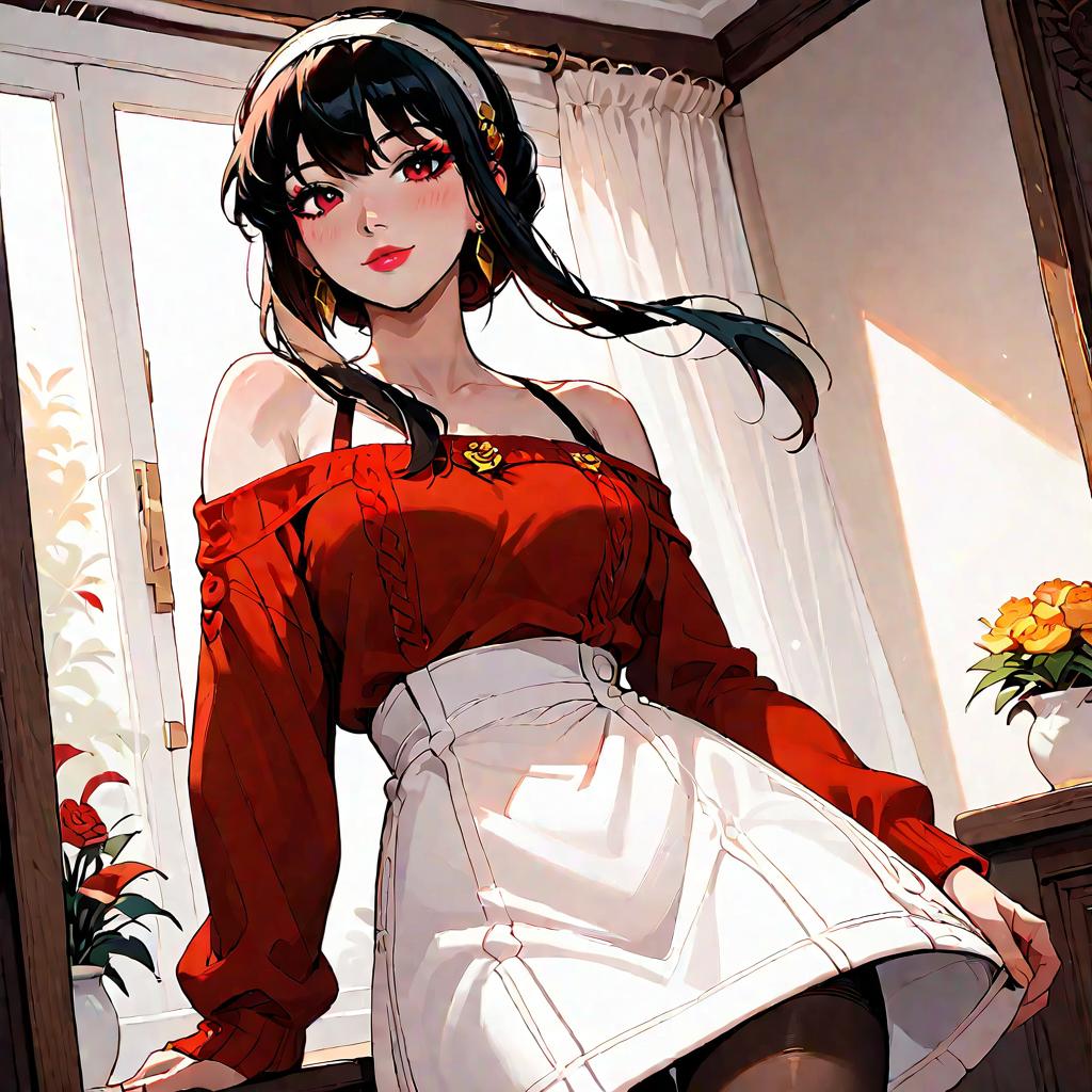 Score_9, score_8_up, score_7_up, source_anime, yorbriar, yor briar, black hair, red eyes, earrings, white hairband, hairband, long hair, sidelocks, smile, bare shoulders, collarbone, dress, long sleeves, off shoulder, off-shoulder dress, off-shoulder sweater, pantyhose, red sweater, sweater, sweater dress, thighs, indoors, looking at viewer, cowboy shot, dutch angle, dynamic pose