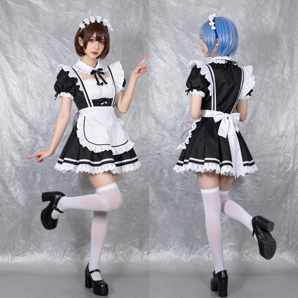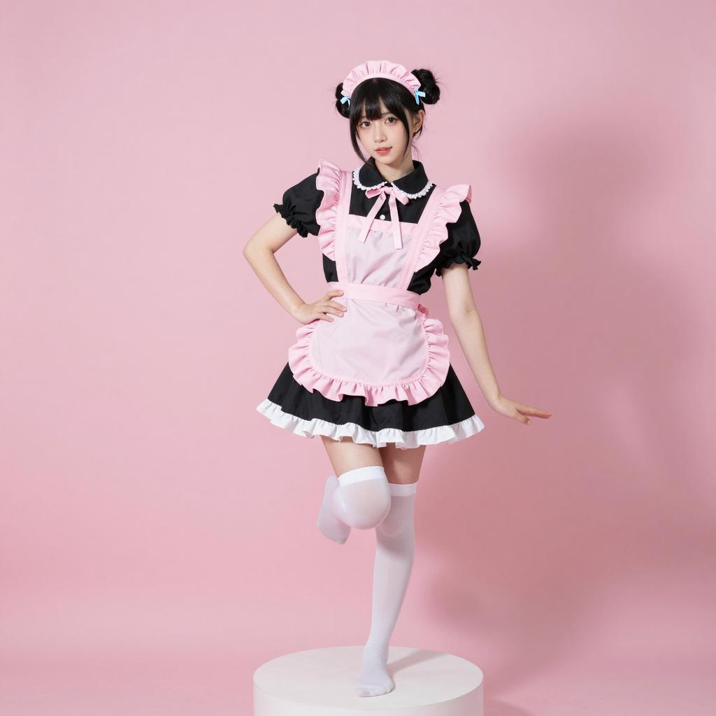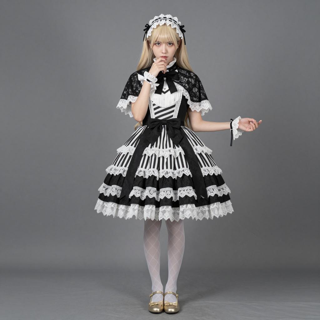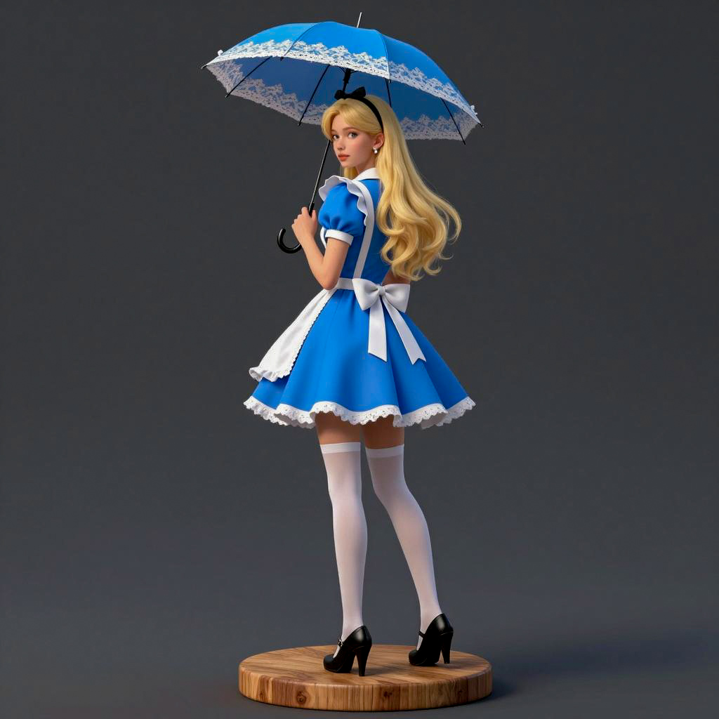 Digital illustration of a blonde woman in a blue Alice in Wonderland-style dress with white lace trim, white thigh-high stockings, and black high heels. She holds a blue lace parasol over her right shoulder, standing on a round wooden base. Her back is to the viewer, head turned to the left with a neutral expression. Gray ured background. She has long, wavy hair and wears a blue bow on her head.