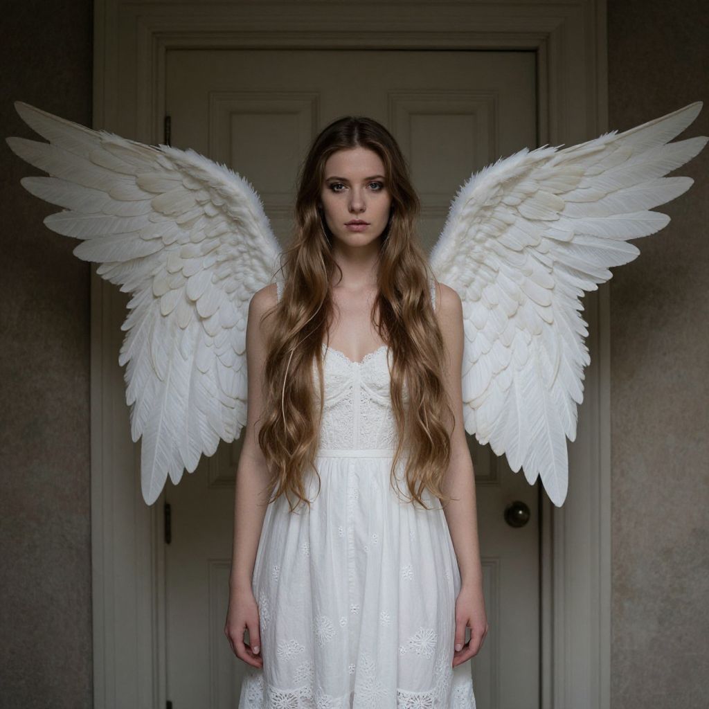 "Twisted Angel Woman, a woman with long hair and wings standing in front of a door"