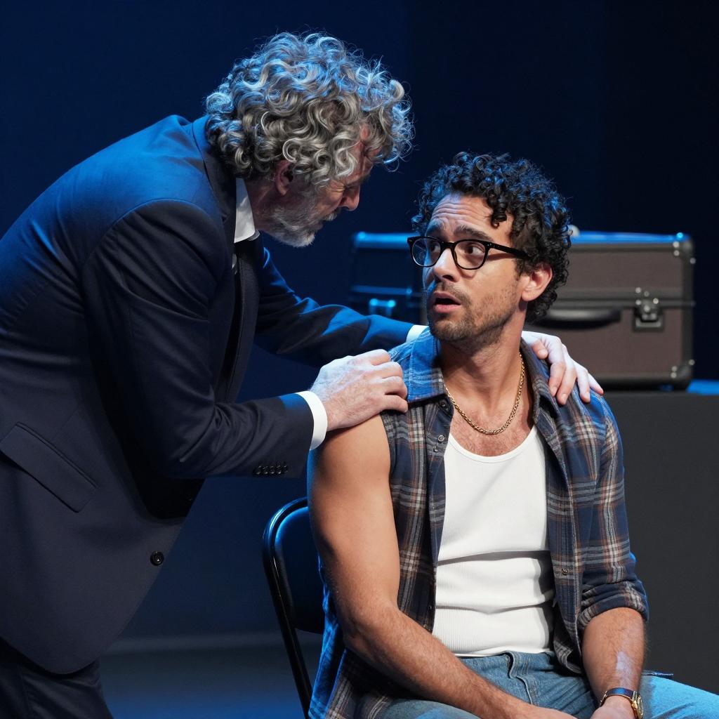 A performance. Center: two male singers, one black in a sequined shirt, one white with a beard, singing passionately. Left: two female dancers, white masks with black lines, leaning forward. Right: another female dancer, similar mask, intense expression. Background: shiny, reflective metallic surfaces, other audience members seated.
