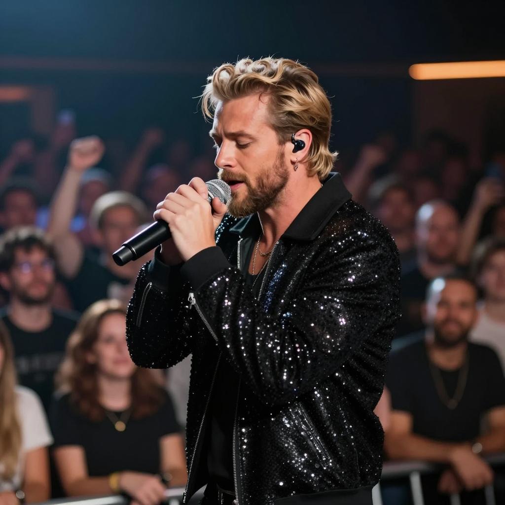 Two male singers passionately perform center stage wearing black sequined shirts and black pants. Surrounding them are female dancers wearing white theatrical masks and black dance outfits, posed in intense, dynamic stances. The backdrop features shiny, reflective metallic curtains with seated audience members watching attentively.