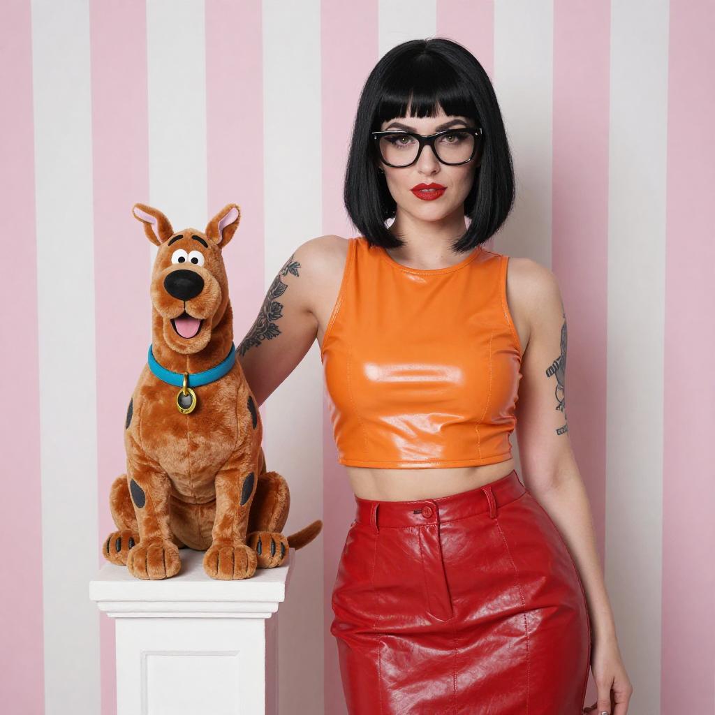 Photograph of a woman with black bob haircut, black-framed glasses, and red lipstick, wearing a shiny orange crop top and red leather skirt. She stands against pink and white striped wallpaper, with her right arm resting on a white pedestal holding a Scooby-Doo plush toy. She has a tattoo on her left arm.