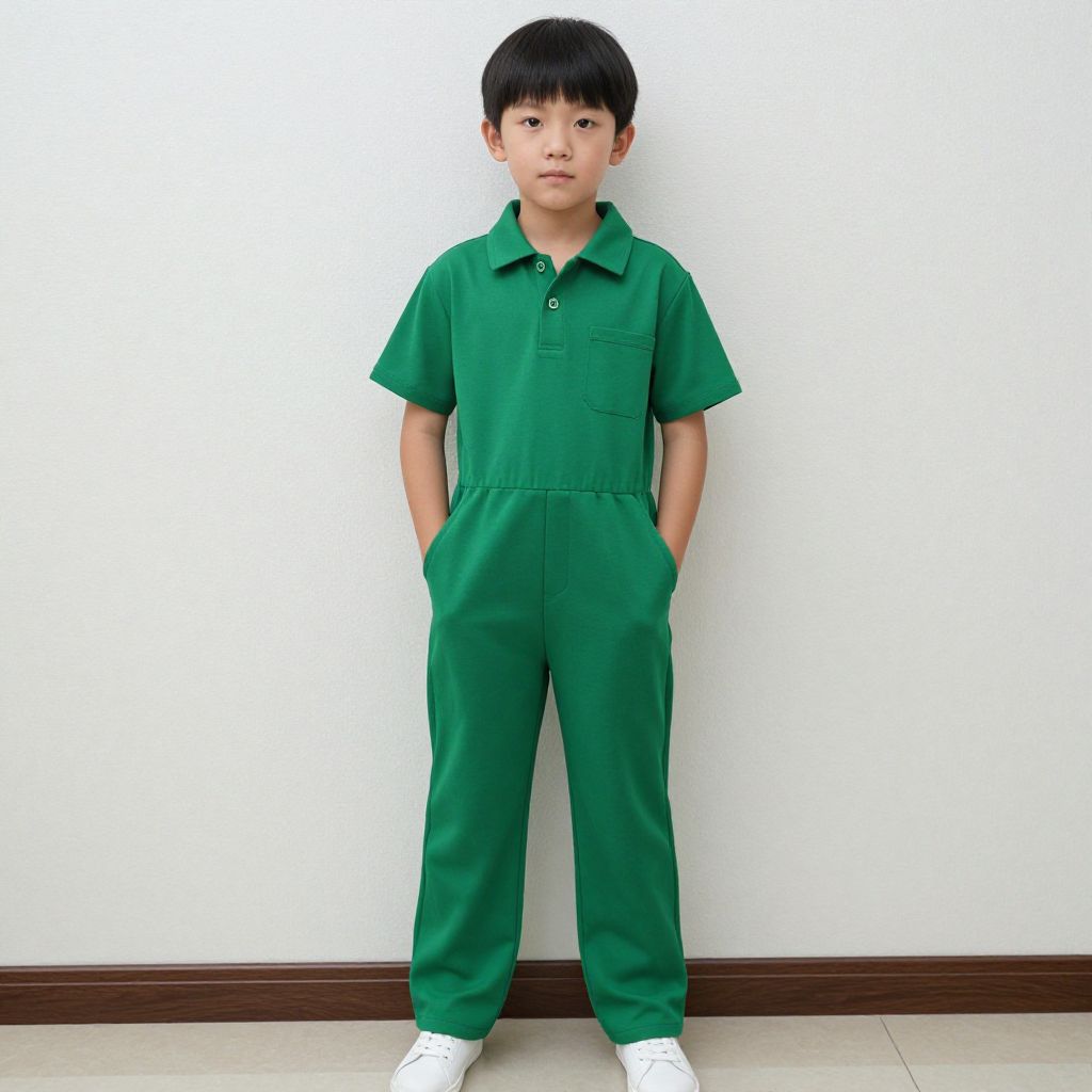 Photograph of a young Asian boy standing against a plain white wall. He has short black hair and a neutral expression. He is wearing a green, short-sleeved polo shirt with a collar and matching green pants with pockets. His hands are in his pants' pockets, and he is wearing white sneakers. The floor is light-colored tile, and the base of the wall is dark brown. The image is brightly lit with no shadows, emphasizing the simplicity and clean background.