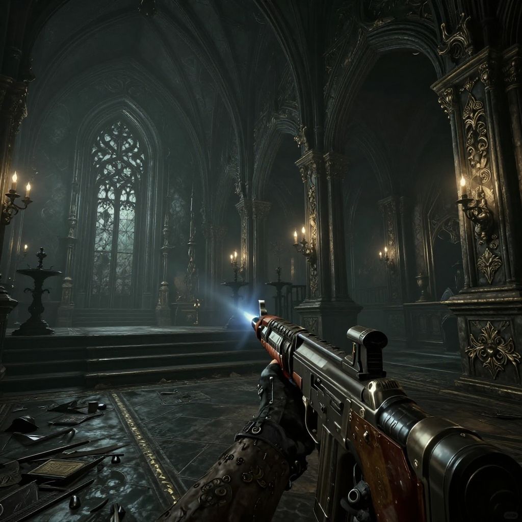 Gothic style photorealistic first person shooter video game screenshot, epic scene . Dark, mysterious, haunting, dramatic, ornate, detailed