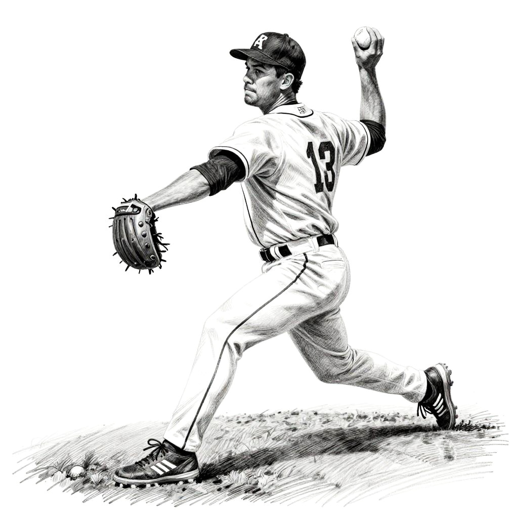 Baseball pencil drawing of an outfielder catching a ball against a stadium backdrop, expressive pencil strokes conveying movement and energy, finely detailed with a focus on light and shadow.
