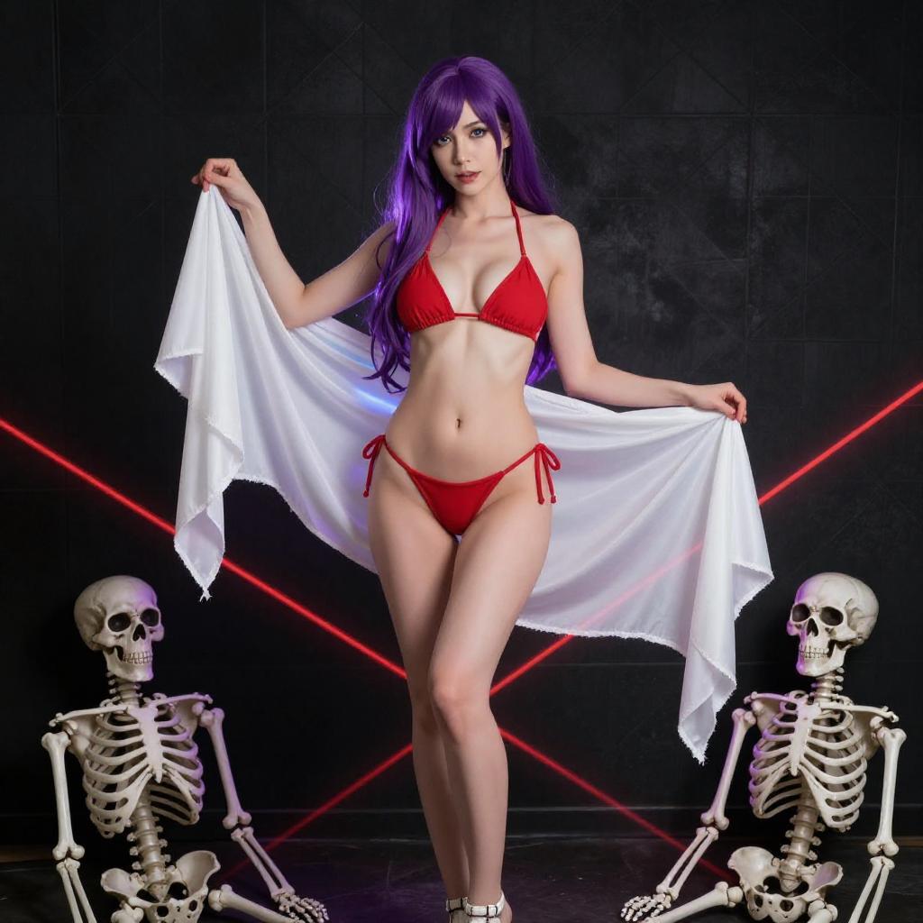 Photograph of a cosplayer with long purple hair, kneeling in front of a dark, diamond-patterned background. She wears a revealing outfit with white, frilled sleeves, a red string thong, and a navy blue cape. Red laser lines cross her body. Behind her are skeletal remains and skulls, adding a macabre atmosphere.