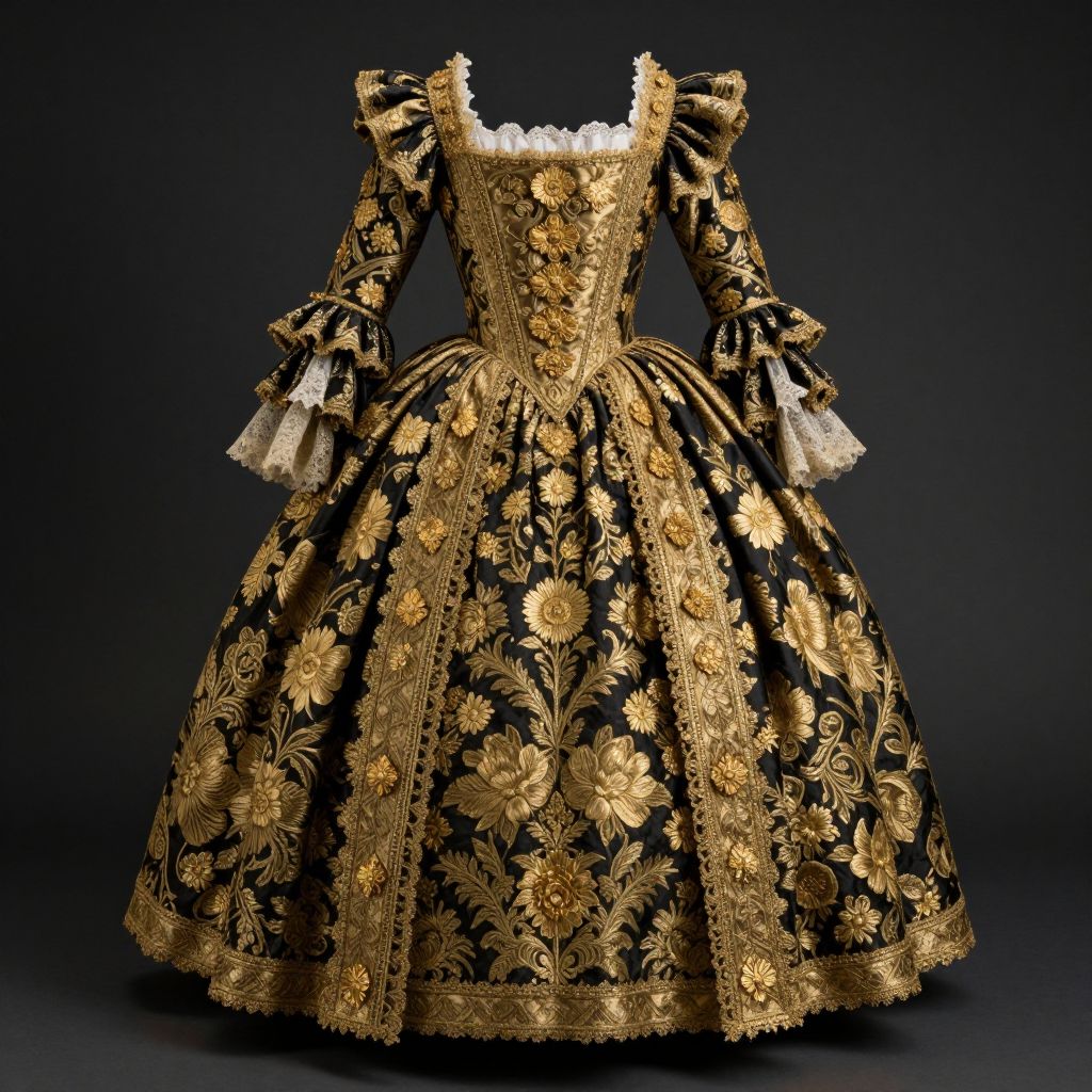 The image showcases a Baroque-style woman's dress, adorned with intricate golden ornaments scattered throughout. The dress features a fitted bodice with elaborate floral patterns and ruffled sleeves, complemented by a voluminous skirt that flares out at the waist. The bodice is embellished with a central floral motif, surrounded by smaller floral designs and golden lace accents. The sleeves are puffed and gathered at the cuffs, adding to the opulent appearance. The overall color palette is dominated by shades of gold and black, creating a striking contrast that highlights the dress's detailed textures and patterns. The dress is displayed against a dark background, which further accentuates its ornate details and the shimmering effect of the golden ornaments.