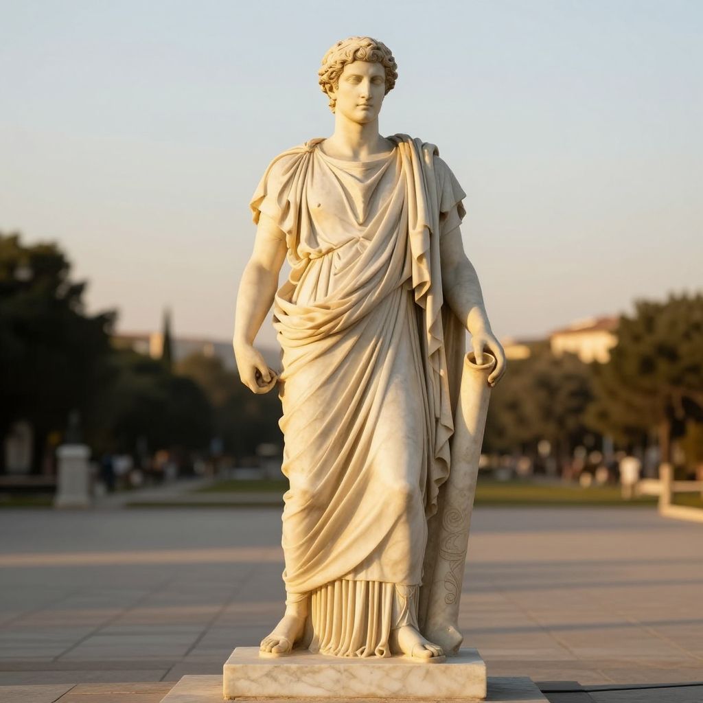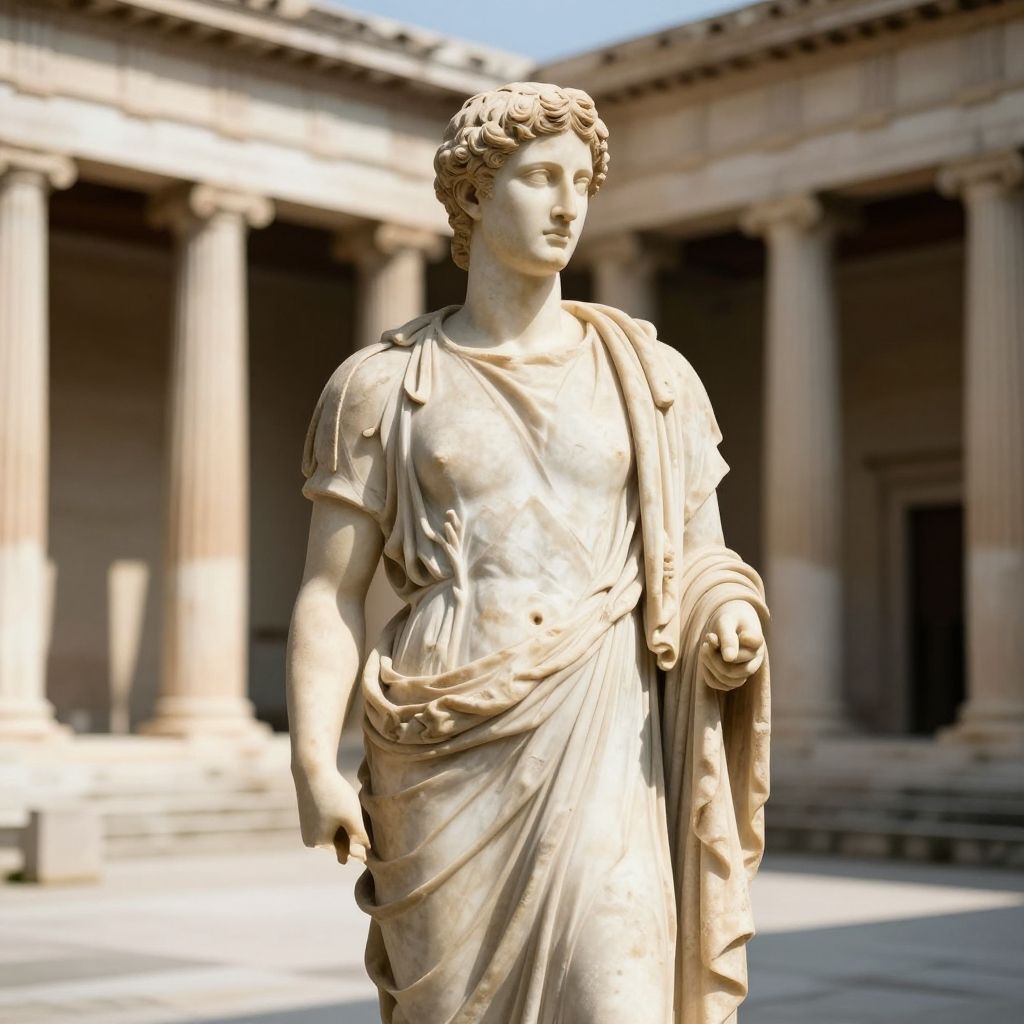 Greek stoic statue standing tall in an ancient temple courtyard, weathered marble with intricate facial features, soft sunlight casting dramatic shadows, classical Greek architecture background