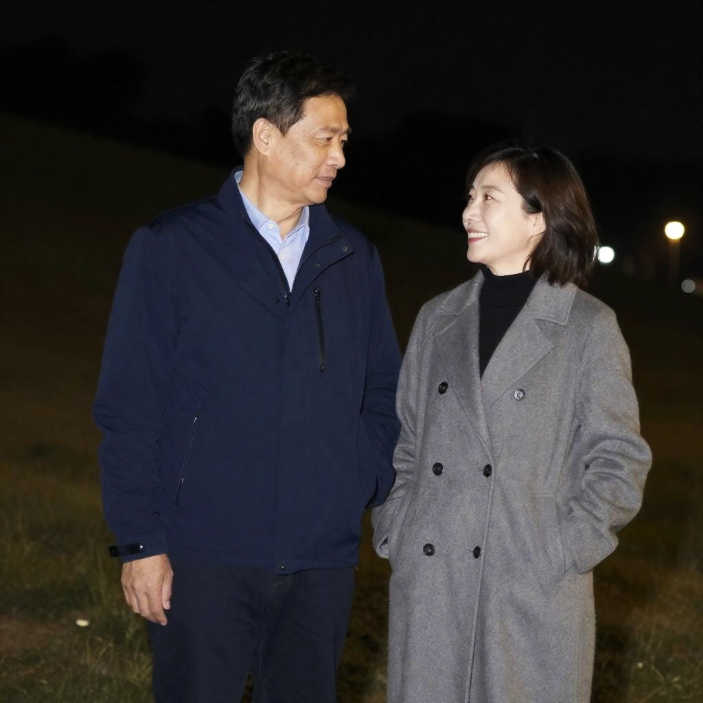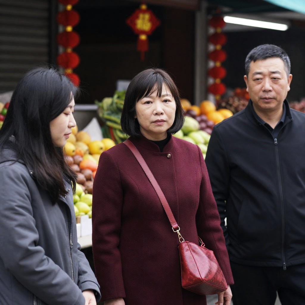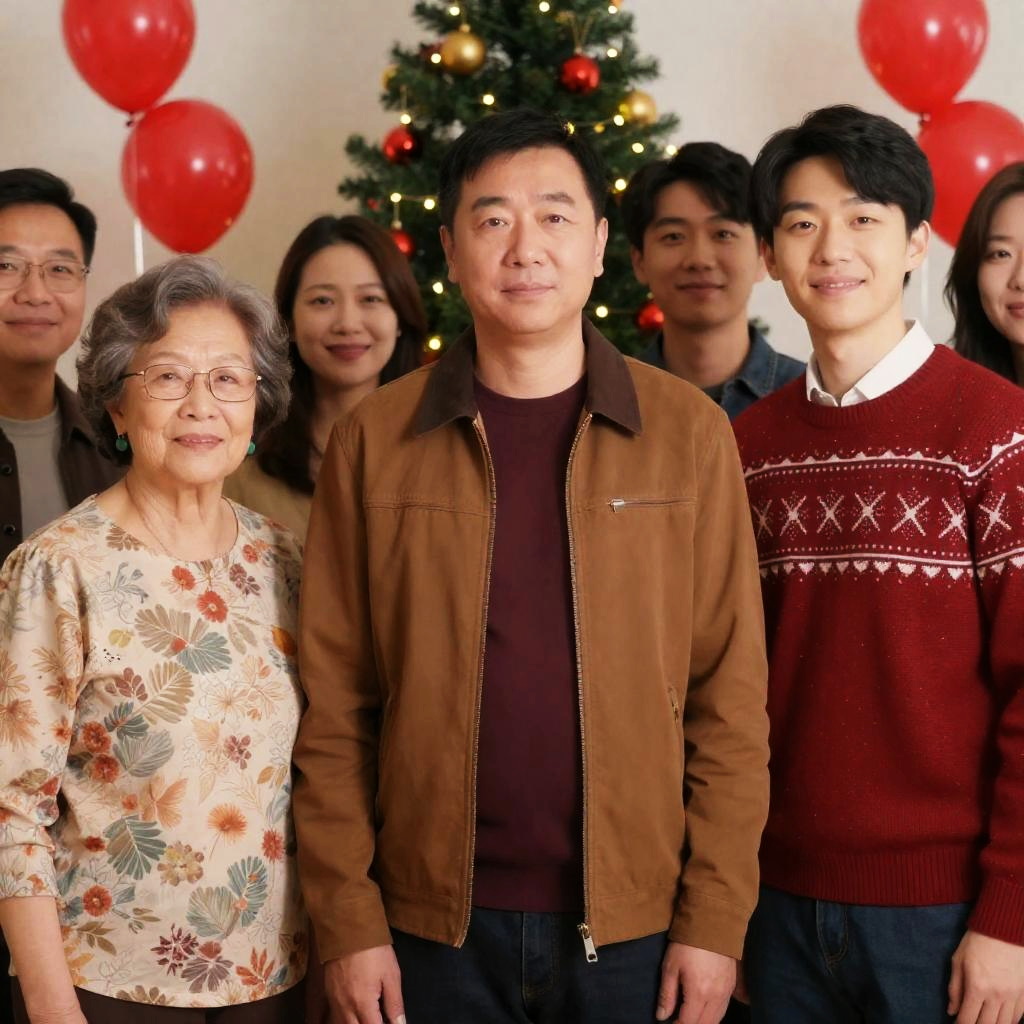 Photograph of three Asian adults on snowy steps at night. Left woman in black coat with blue scarf, smiling. Center woman in red coat, clapping, smiling. Right man in green coat, plaid scarf, red and white boots, holding cane. Red poinsettias and candles in background. Snow on steps and ground. All standing and sitting on steps, smiling.