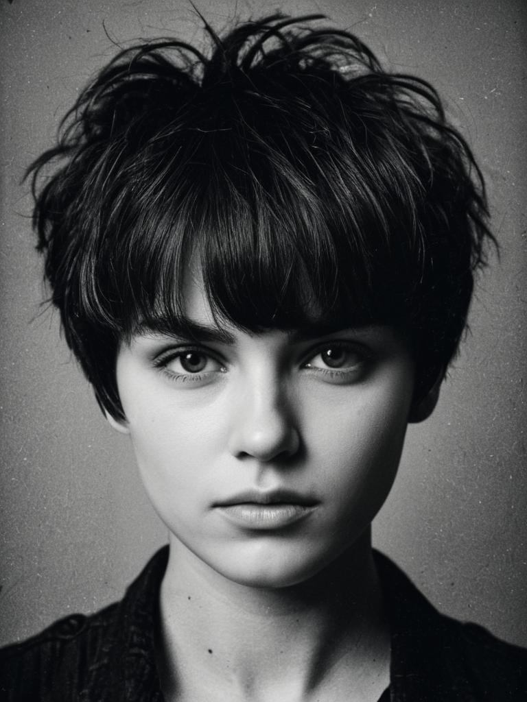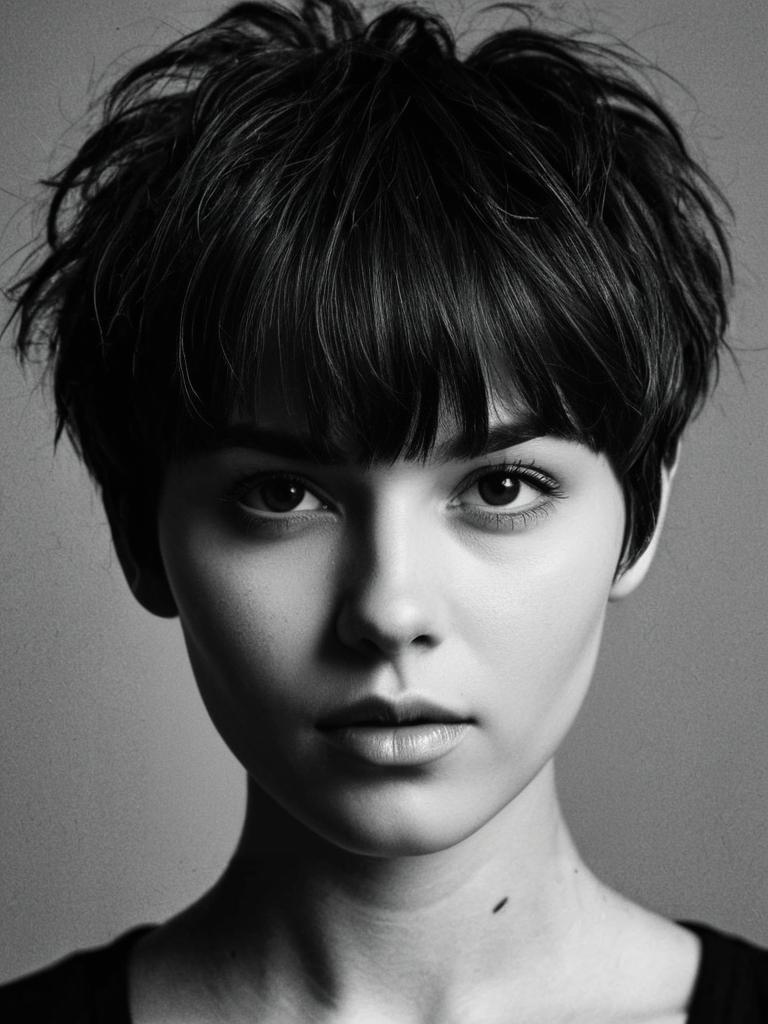 Woman with Messy Pixie Cut and Bangs hairstyle, detailed dramatic portrait