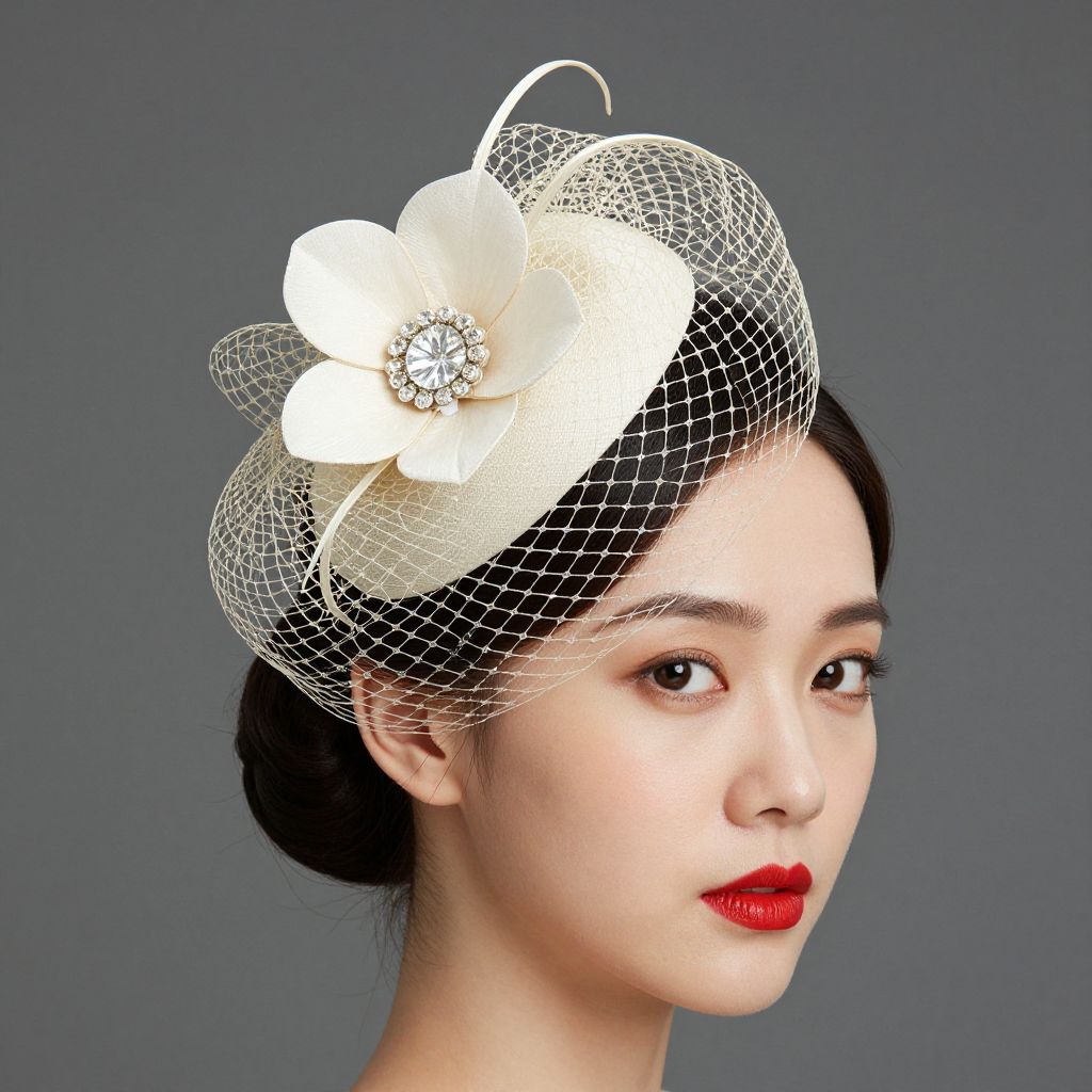 Elegant fascinator featuring a cream-colored flower with a crystal center, paired with a delicate French net veil, worn by a woman with a classic updo hairstyle and bold red lipstick.