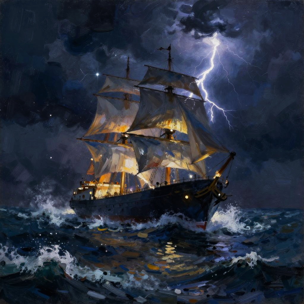 Dramatic painting of a stormy sea: a ship with blazing sails and lightning illuminating dark clouds, waves crashing around.