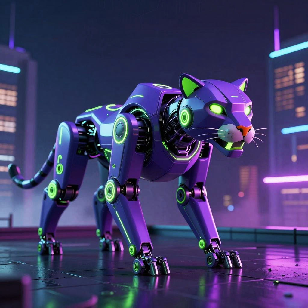 3D robotic panther, rendered in a futuristic neon theme within midnight rooftop of a neon metropolis, glowing edges and dynamic reflections, dark abstract background with subtle geometric patterns, high-poly hard-surface detail, calibrated color grading, volumetric fog, rim lighting, soft bloom, global illumination, ambient occlusion, reflective wet floor, ultra sharp microdetail, octane/unreal look, accented by deep purple and fluorescent green, depth of field, noise-free finish