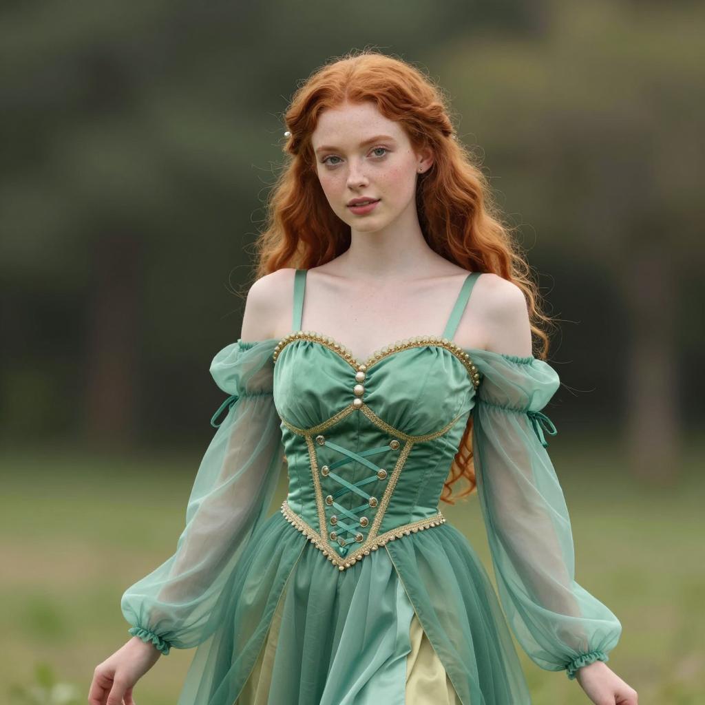 Portrait of a young woman with long red hair wearing a green Ariel-inspired costume dress outdoors. The dress features long sleeves, a corset-style top with detailed embellishments, and a flowing skirt. The subject has fair skin, light makeup, and is looking directly at the camera against a blurred natural green background.