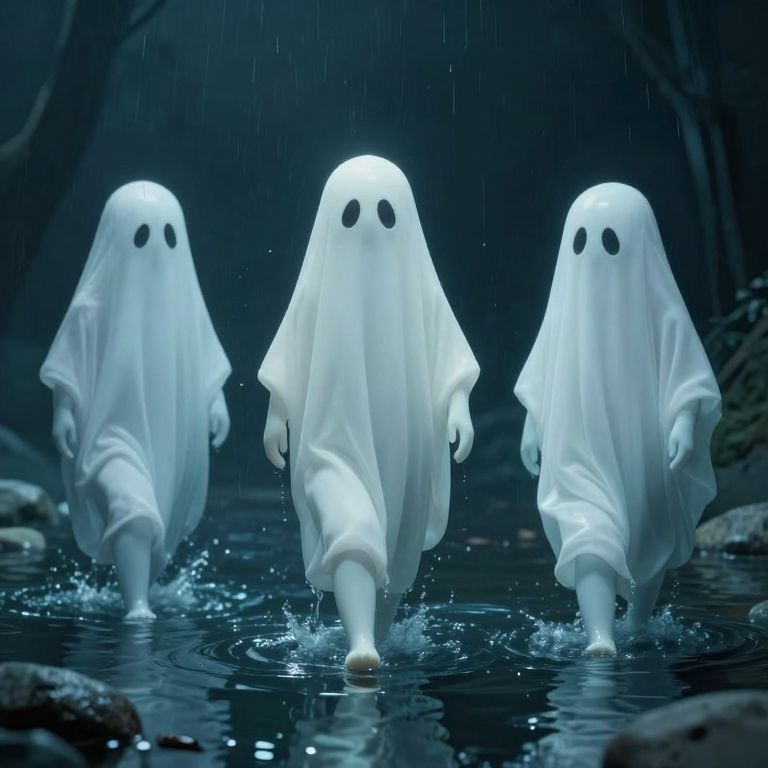 Photograph of three ghost-like figures with white, translucent, flowing robes and black, oval eyes, walking through a dark, rain-soaked forest. They are in a shallow, reflective stream, creating splashes with each step. The background is dimly lit, with dark, blurred trees on either side. The ghosts have a smooth, featureless appearance, and the raindrops are visible in the air. The overall mood is eerie and mysterious, with a cool blue and black color palette.