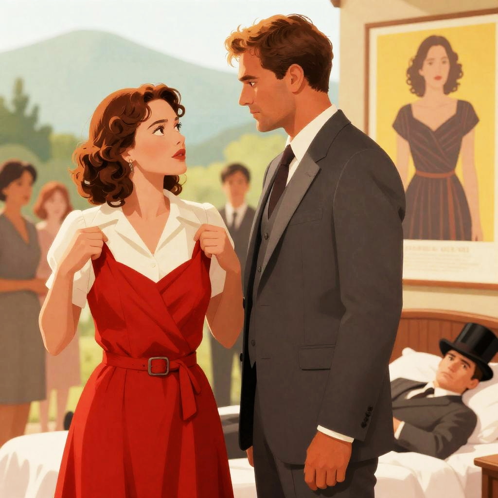 Movie poster illustration. Caucasian woman in red dress being chased by men in blue robes, holding a rifle. White horse, man in blue suit with hat, and women in dresses in background. Trees and rustic building. Chased, tense expressions.