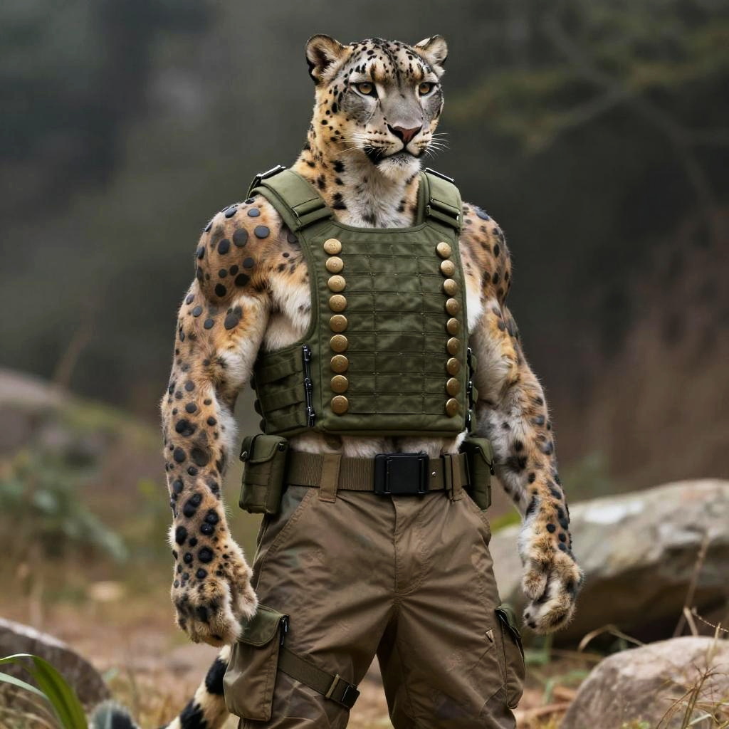 Anthro, snow leopard, solo, male, adult, veiny muscles, muscular, bulletproof vest, military pants, realistic scales, detailed background, wilderness background, realistic, photorealistic, ultra realistic, 8k